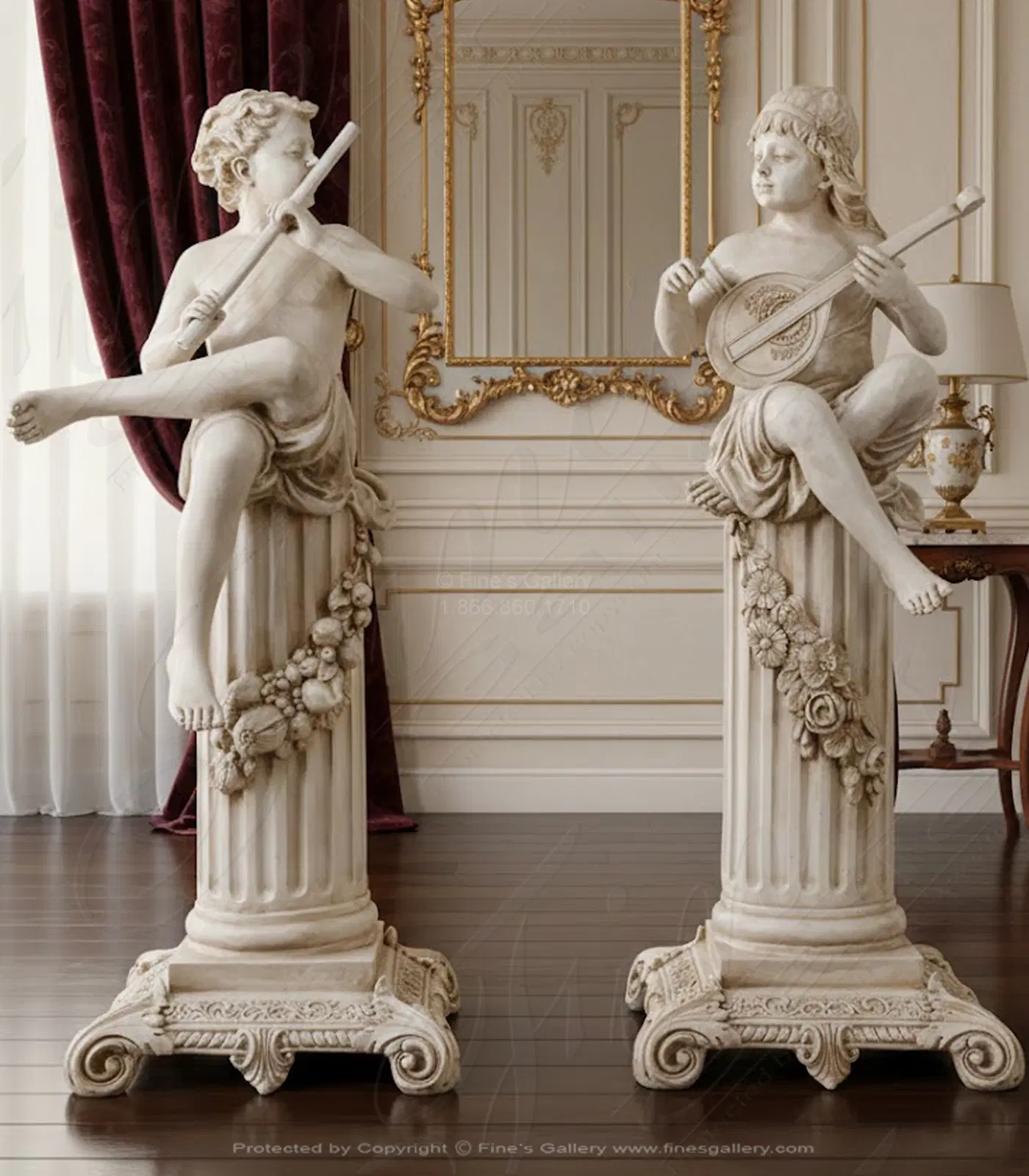 Cast Marble Child Flutist and Mandolin Player Pair. This cast stone statue pair features two children playing musical instruments, one depicting a young flutist, the other a young lady playing a mandolin, in classical style.