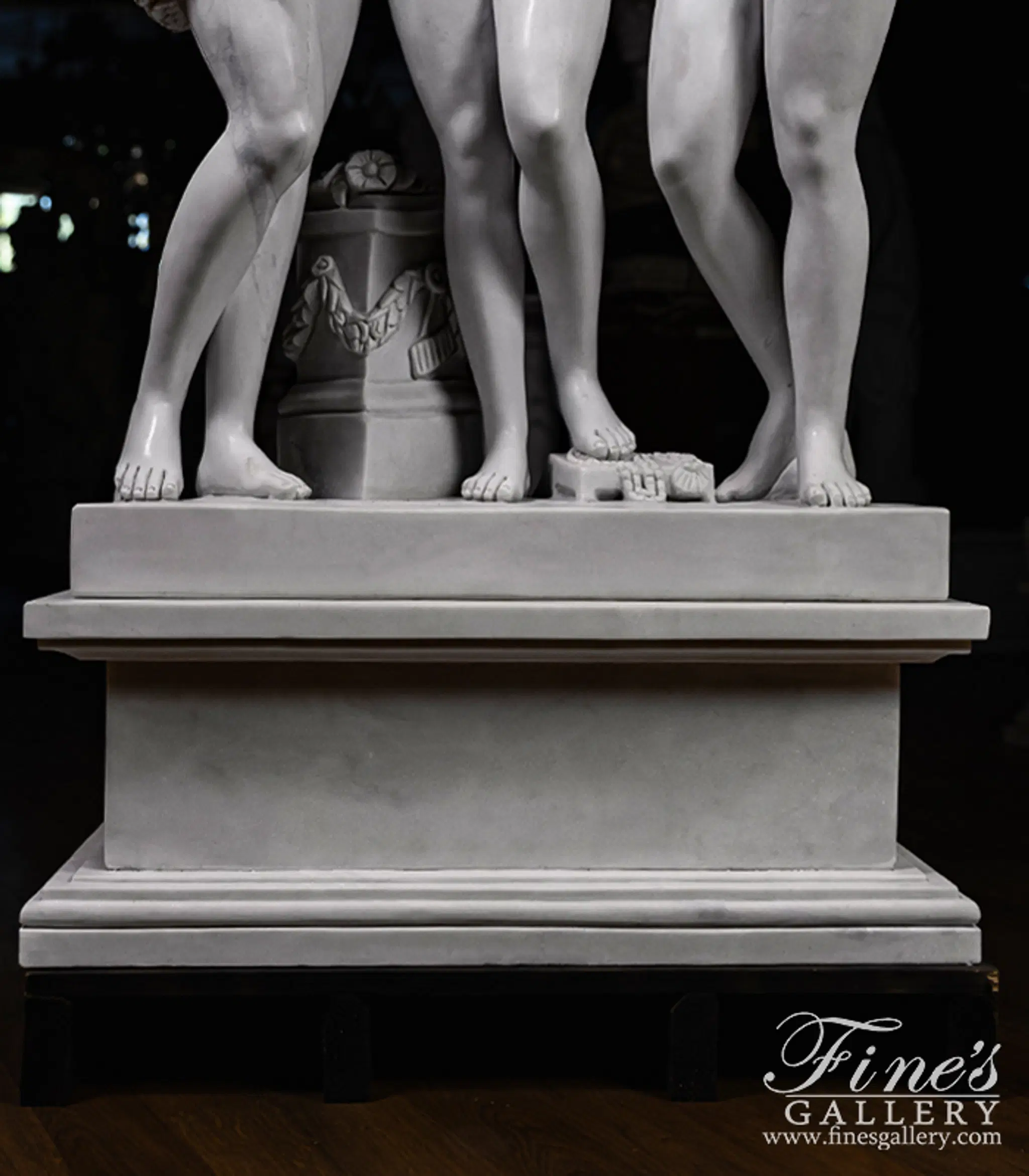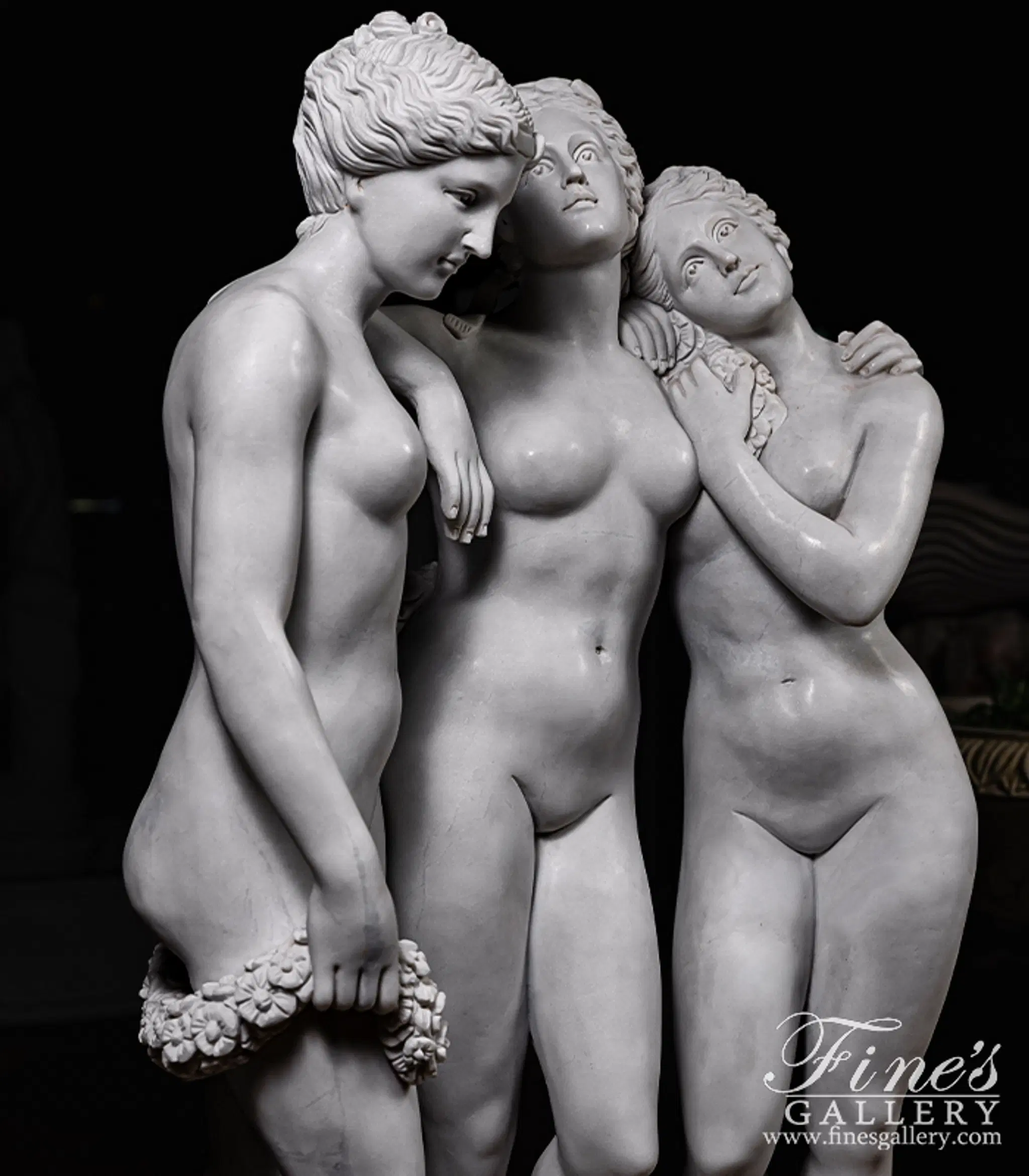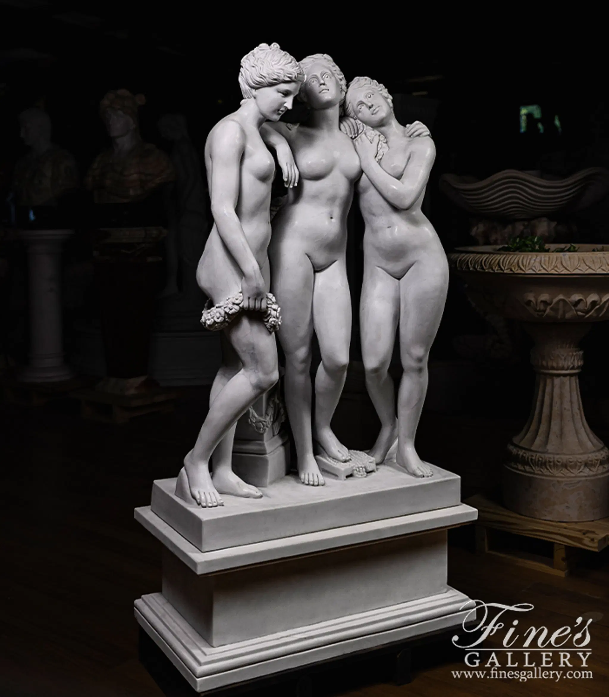 Three Graces Marble Statue carved from solid white marble. The three daughters of Zeus represent beauty and elegance. 48 Inch tall statues included with 12 Inch tall matching statuary white marble pedestal.