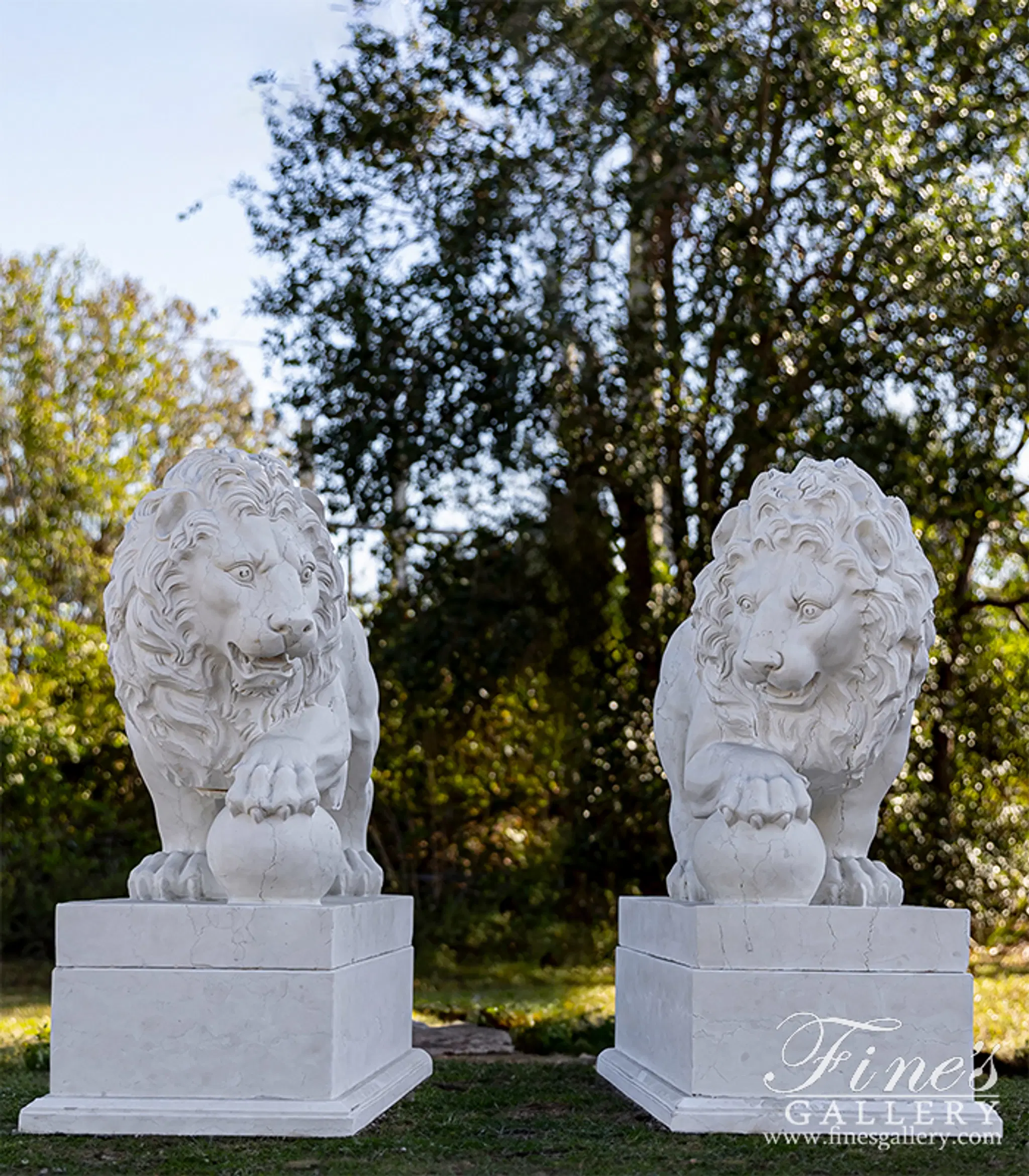 Italian Perlino Marble Lion Pair. Carved from stunning Bianco Perlino italian marble. 27 inch tall x 36 inch width x 14 inch depth. Includes 8 inch tall pedestals.