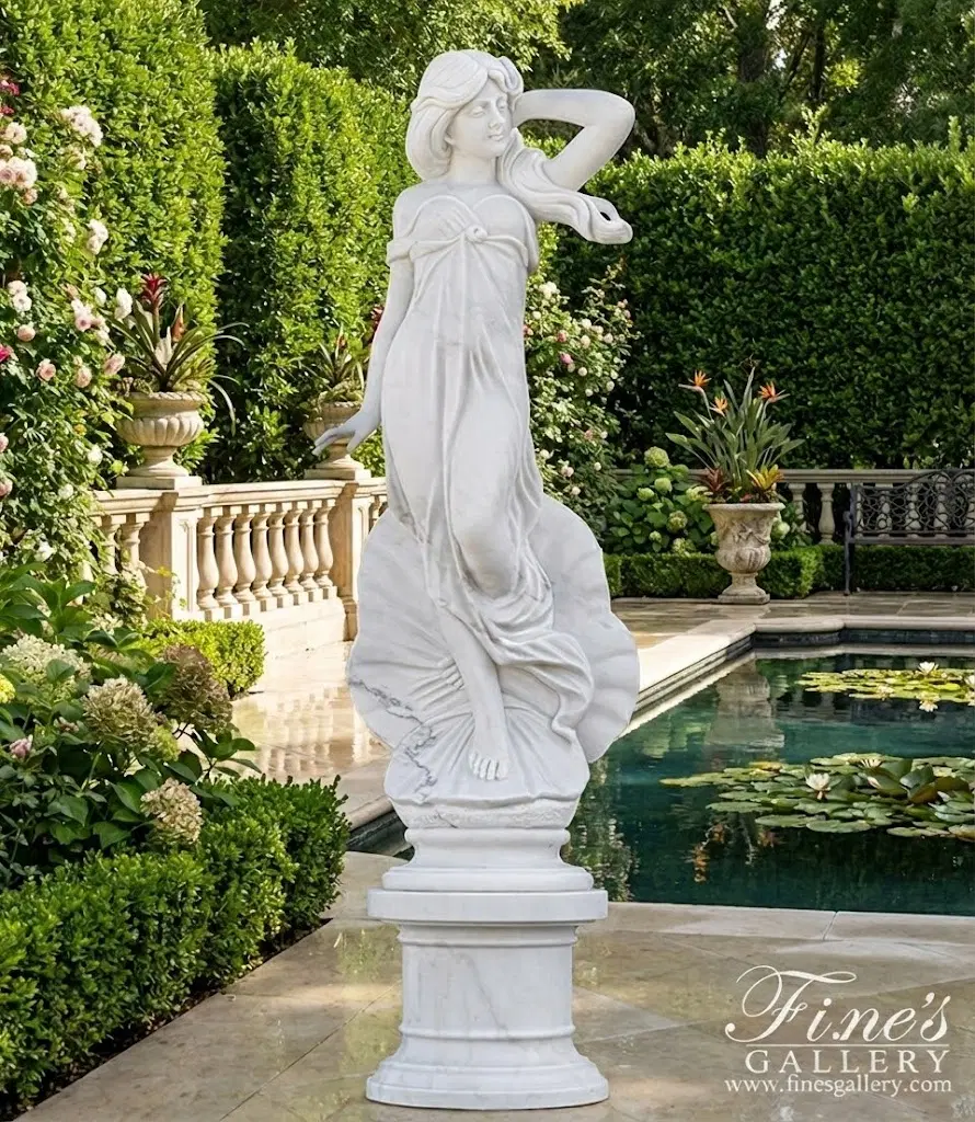 Exquisite Allegorical Nymph Statue in Pure White Marble - Elegant Classical Garden Sculpture for Home, Estate or Garden Decor - Handcrafted Mythological Figure with Timeless Beauty - Marble Pedestal Available Separately - Fine Art Collectible. Marble Pedestal available separately.