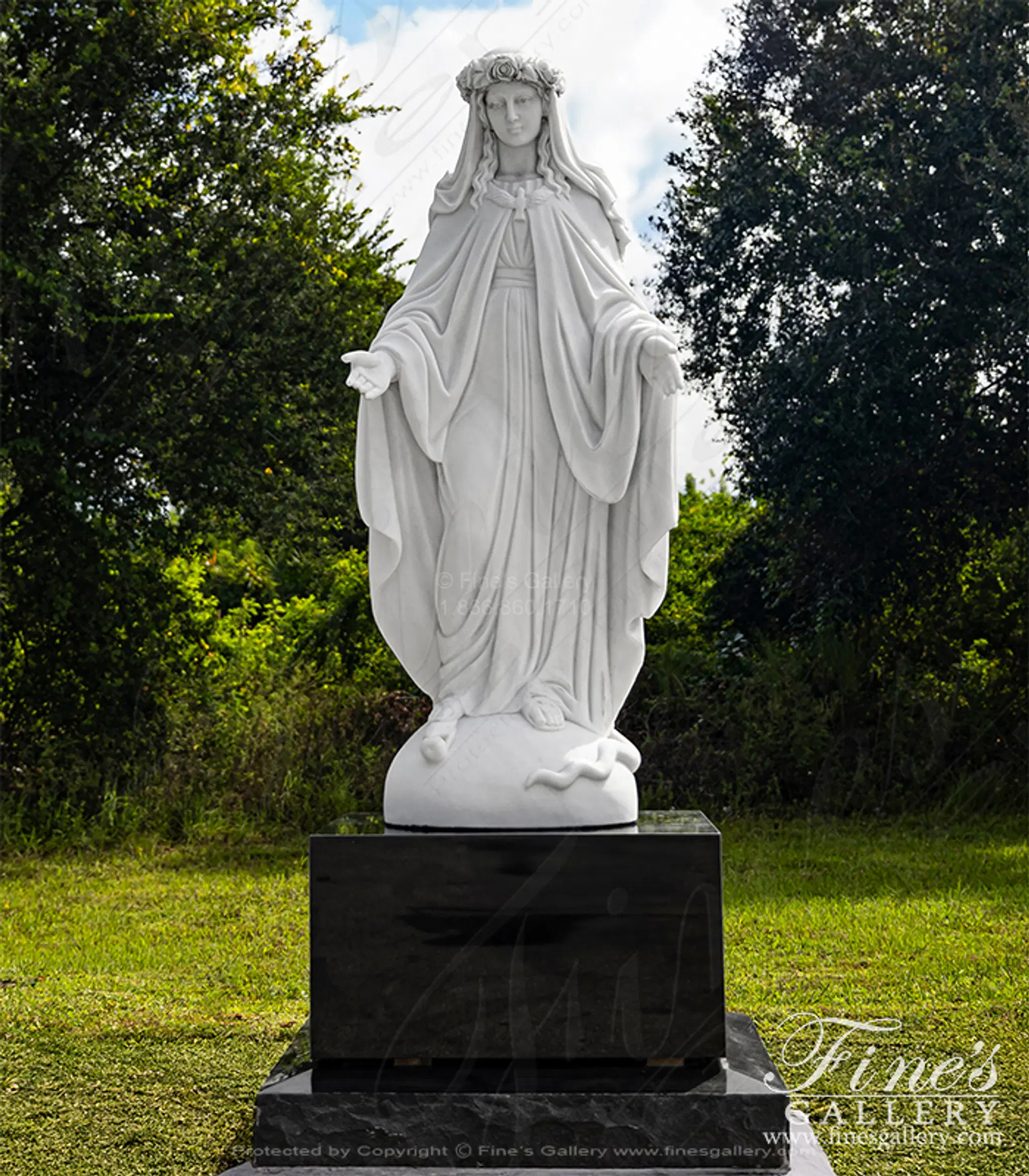 Our Lady of Grace with Rose Garland Head Dress in hand carved Statuary White Marble. The Mystic Rosa is available to for Nationwide delivery. Optional Matching Pedestal - sold separately - Pedestal size - 12 in tall x 19.75 in wide x 15.75 in. depth