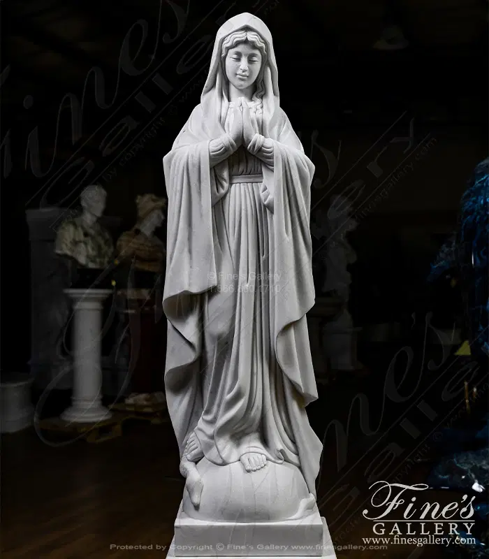 Our Lady Praying Statue in Carved Statuary Marble - 48 Inches Tall. This exquisite hand-carved religious statue depicts Our Lady in prayer, masterfully crafted from premium statuary marble with meticulous attention to detail. Standing 48 inches tall (14.50 inches wide and 9.50 inches deep), this devotional piece brings timeless elegance to churches, gardens, or home sanctuaries. Optional matching pedestal available separately (14 x 15 x 11.50 inches). Each statue is individually carved by skilled artisans, ensuring a unique spiritual centerpiece that honors sacred tradition with artistic excellence.