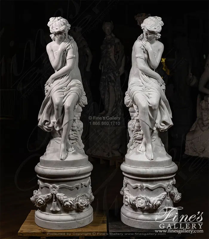 Marble Enchantress Pair Featuring Ornate Rose Garland Pedestals - MS-1485
