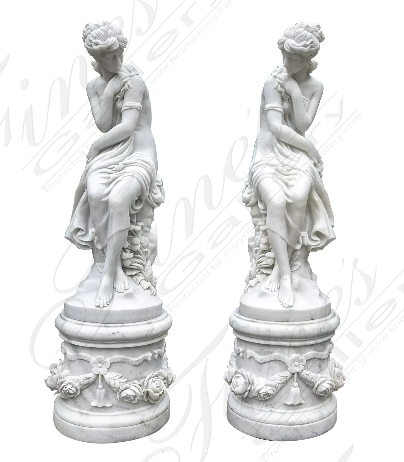 This stunning hand carved art work is a timeless marble classic. Offered as a pair which includes two statues and two pedestals. Statues Size - 48 x 18 x 18 - Pedestals Size - 18 x 19 x 19