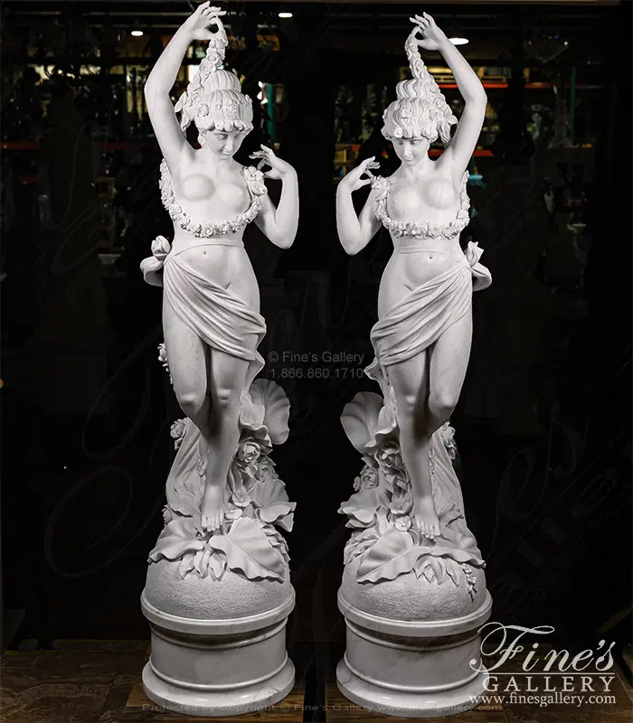 Marble statue pairs create compelling symmetrical displays that elevate grand entrances, formal gardens, and expansive interiors with classical elegance. These carefully matched sculptures bring harmonious balance to luxury estates, whether flanking doorways, garden pathways, or serving as commanding focal points in great rooms. Hand-carved from premium natural marble including statuary white and travertine, each pair offers the timeless appeal of museum-quality craftsmanship.