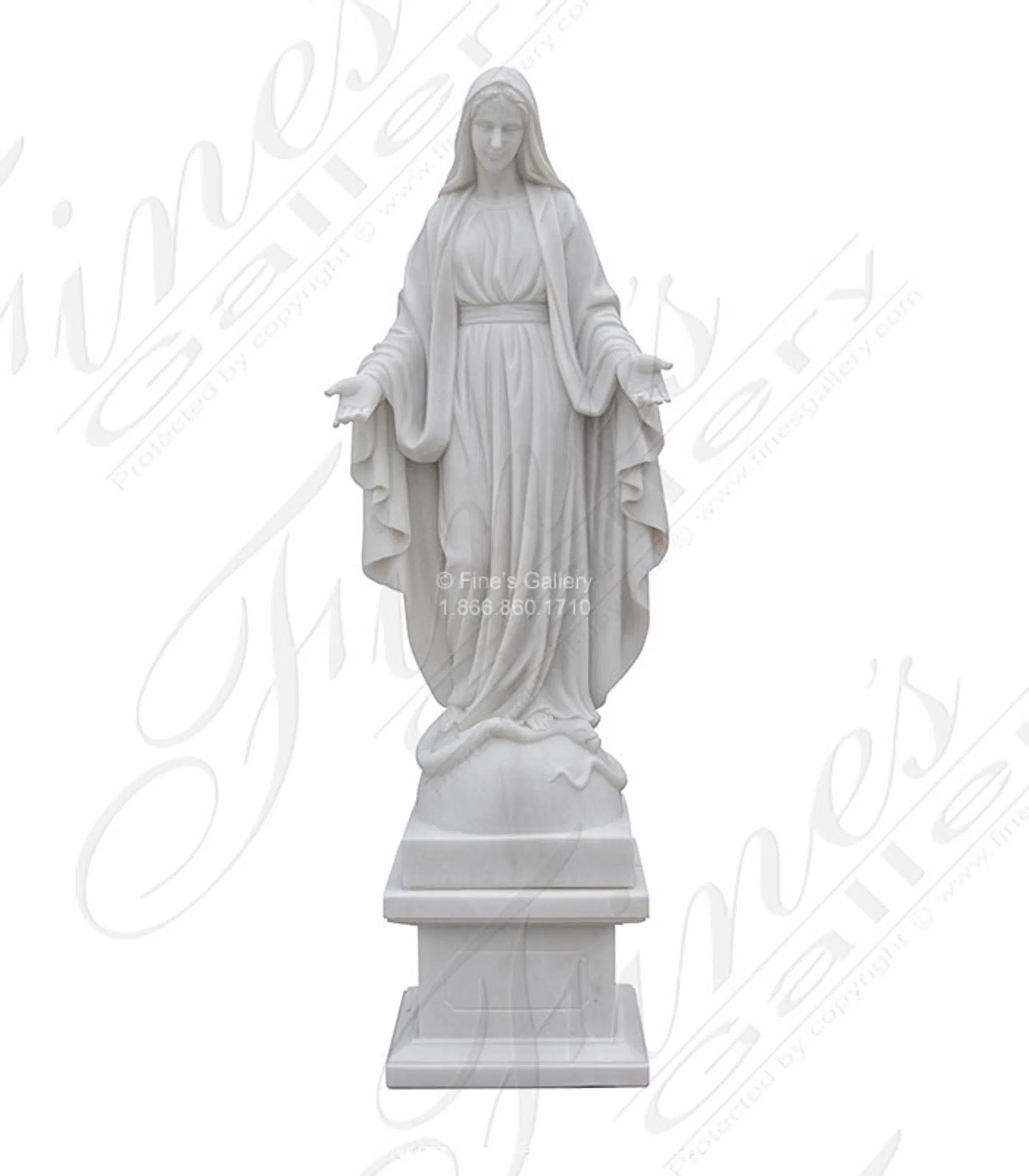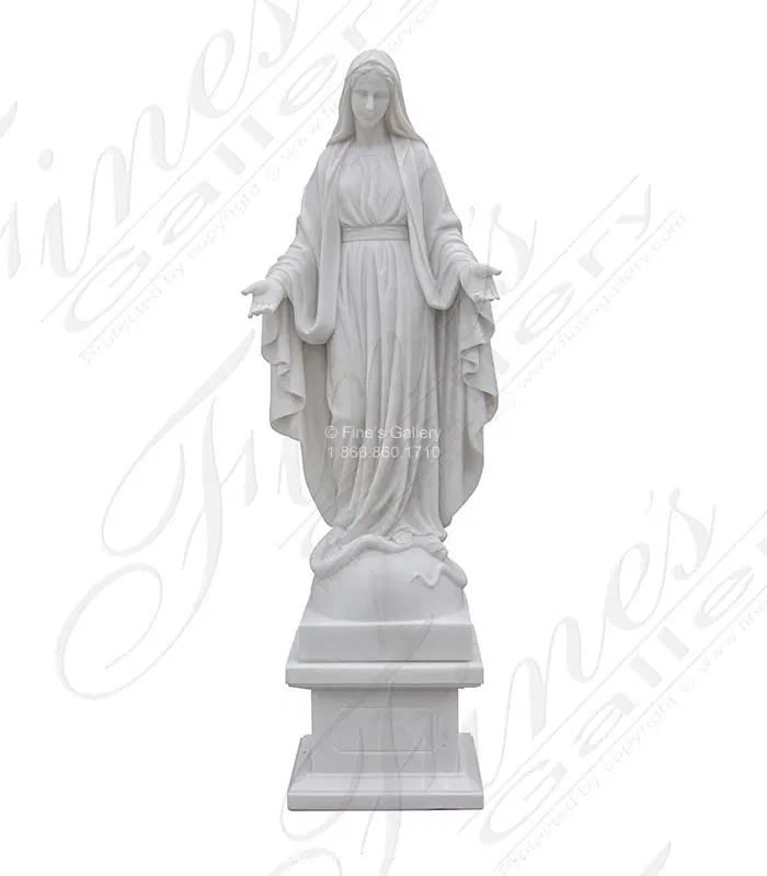 48 Inch Our Lady of Grace in Statuary White Marble. A very fine hand carved museum quality statue. Optional 12 Inch tall pedestal included. Optional Pedestal Measures 12 in x 15.75 in x 12.75 in