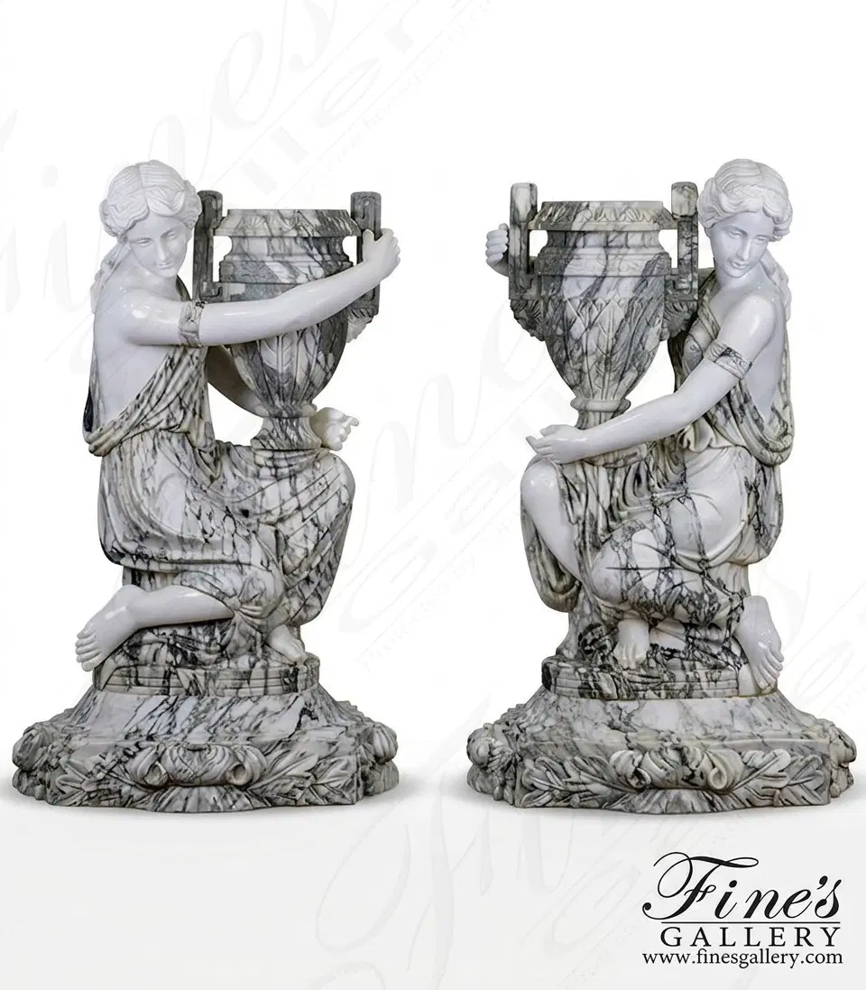 Handcrafted from two-toned statuary white and arabascato marble, these breathtaking decorative sculptures feature elegant female figures in kneeling poses holding ornate urns. Each statue in this stunning pair showcases exceptional artisanship with intricate carving details, perfect as sophisticated focal points for luxury home décor, garden settings, or interior design projects.