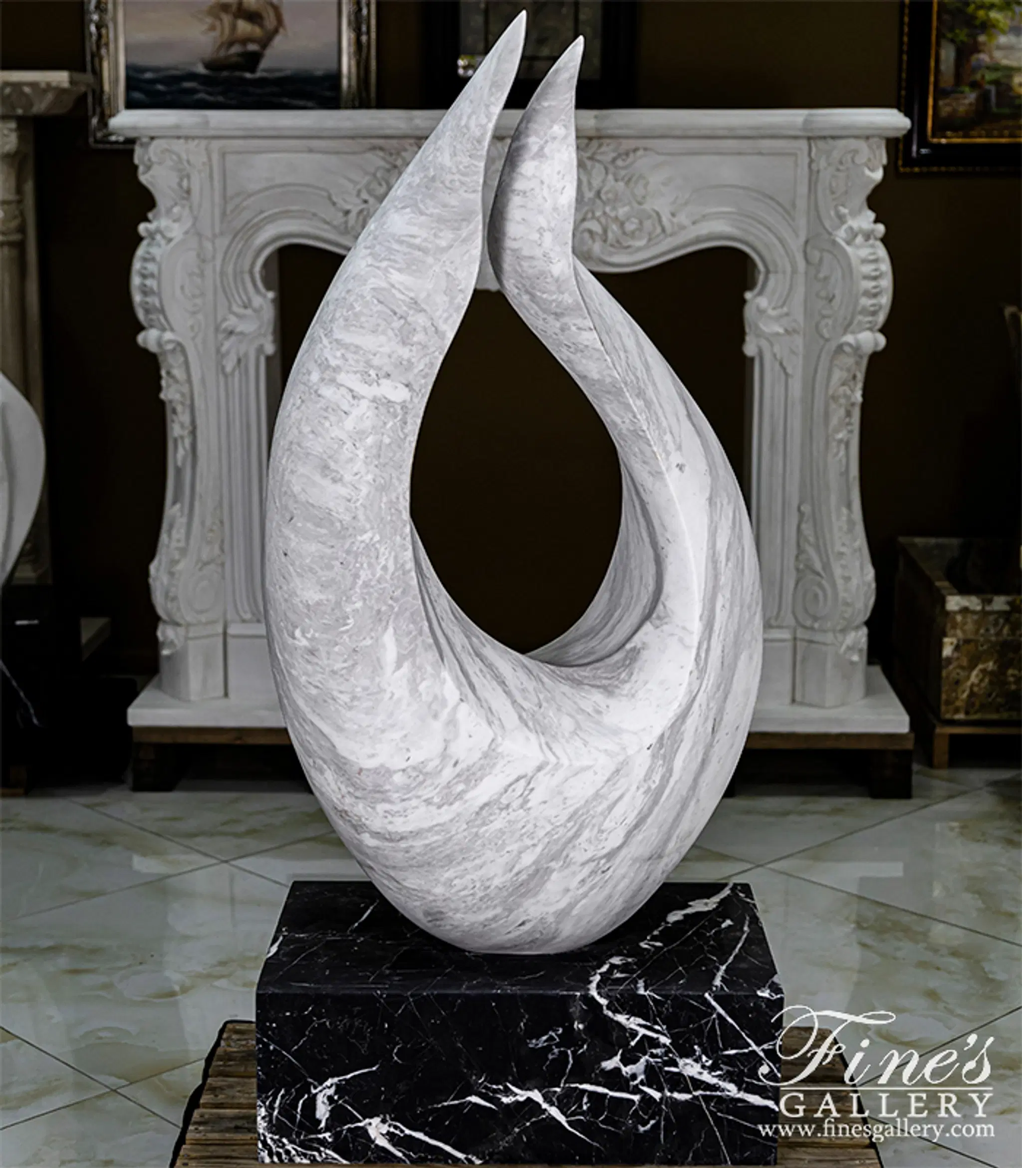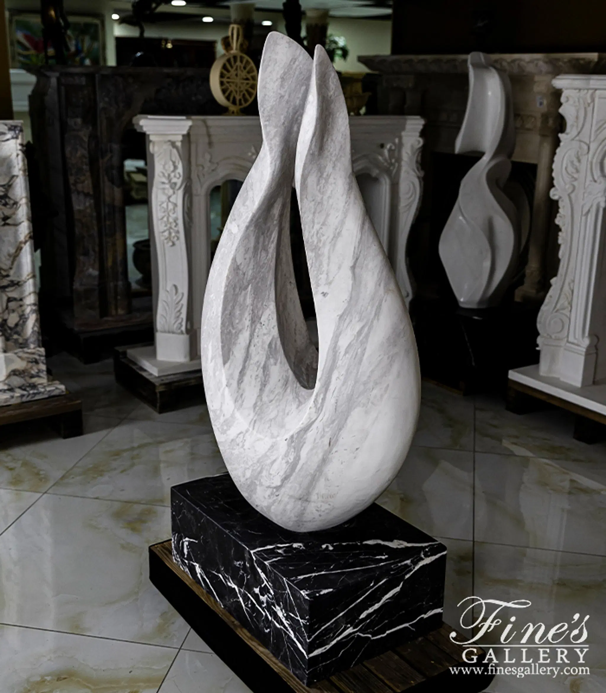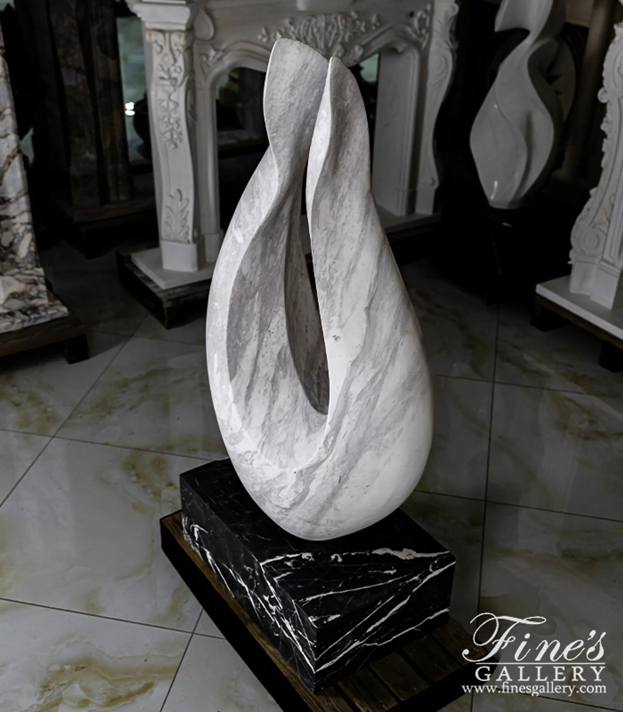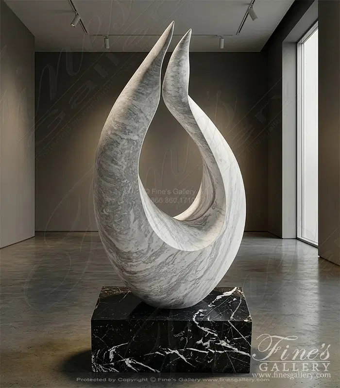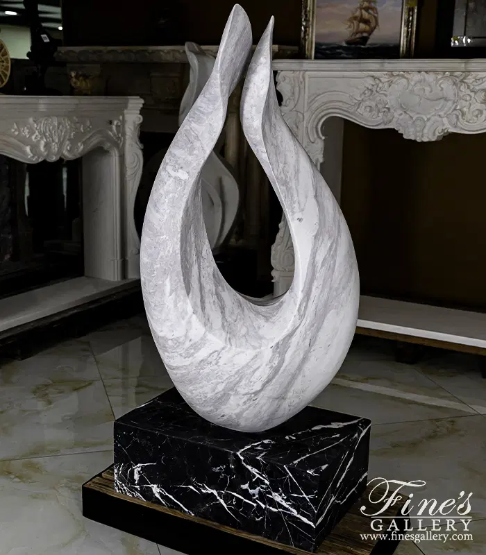 An Abstract marble statue carved from a hand picked Grecian quarried Volokas marble. Set on top of a solid Nero Marquina pedestal. Abstract Flame measures 50" x 28". Solid Nero Marquina Base measures 9 3/4" x 28" x 17 3/4"