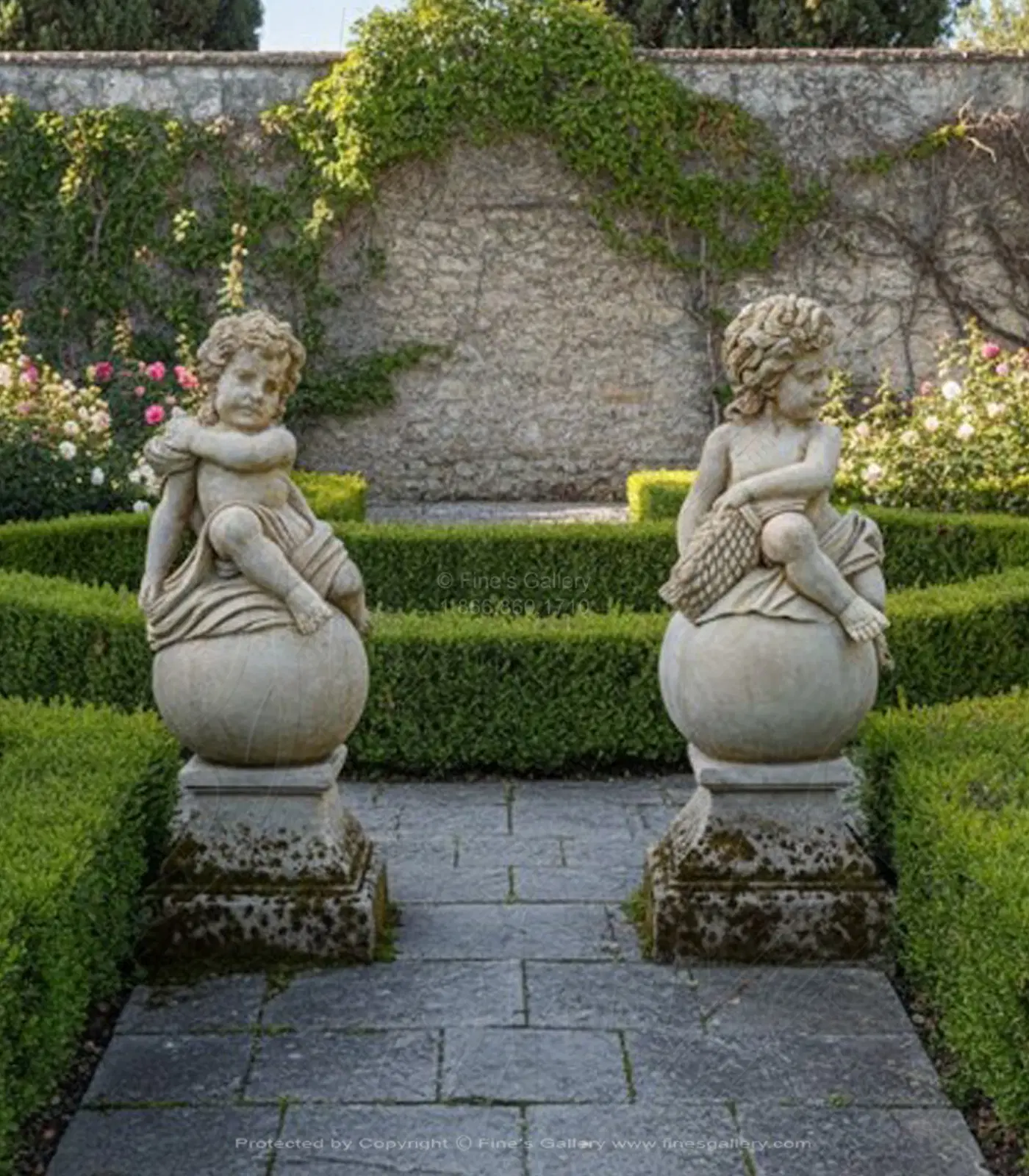 A lovely pair of cherubs depict the seasons and bring joy all year round. Each is posed on an intricately carved Roman Corinthian style base. A vintage statue pair, roughly 20 years of age.