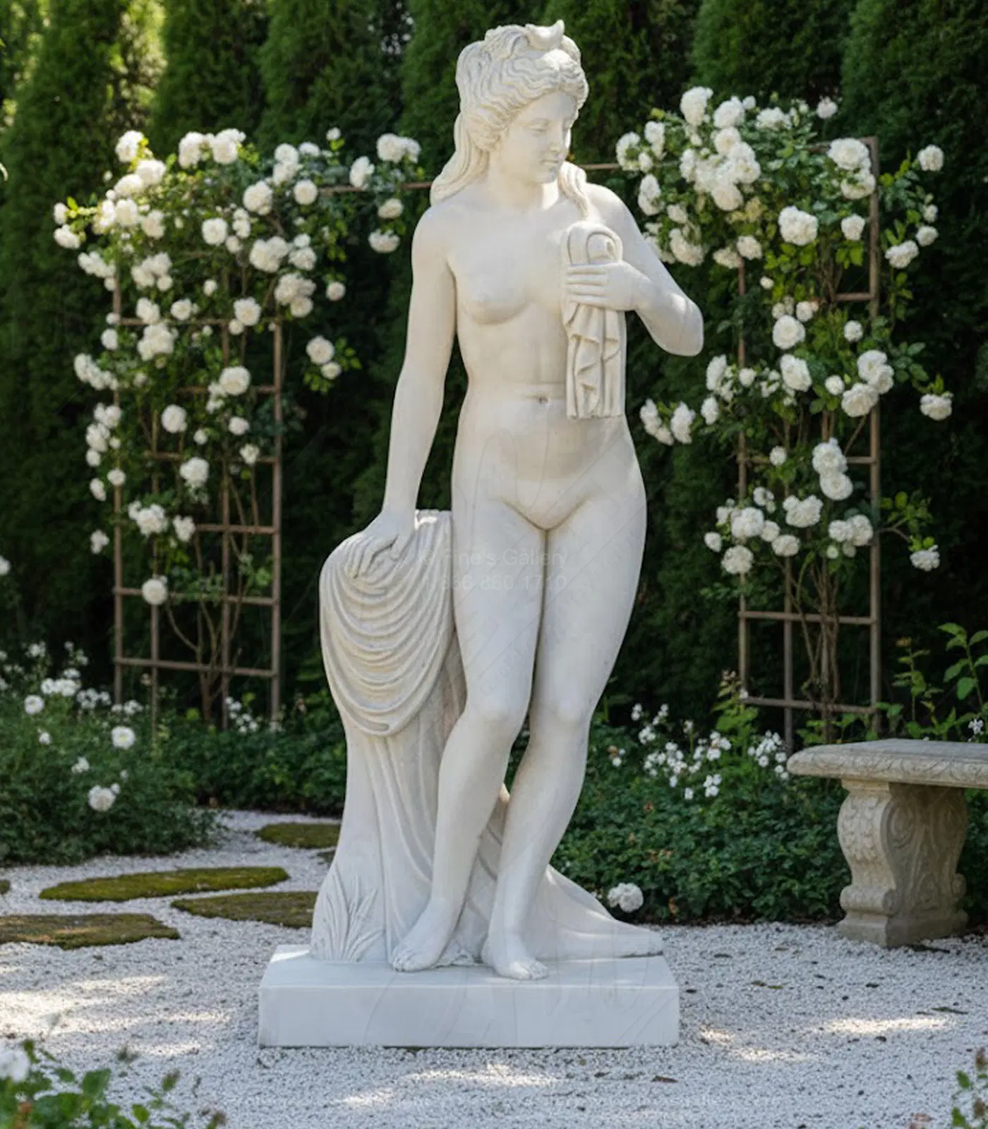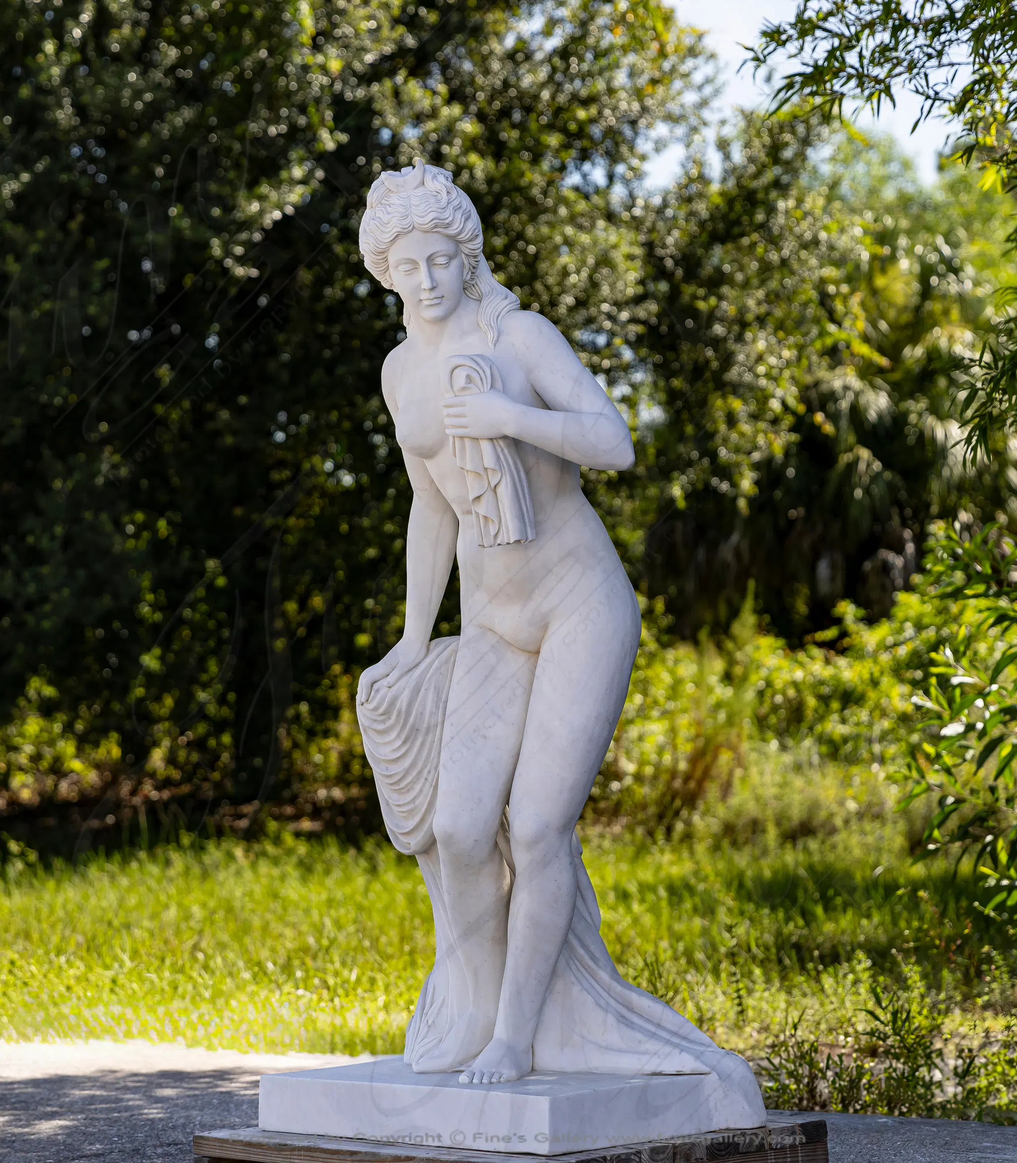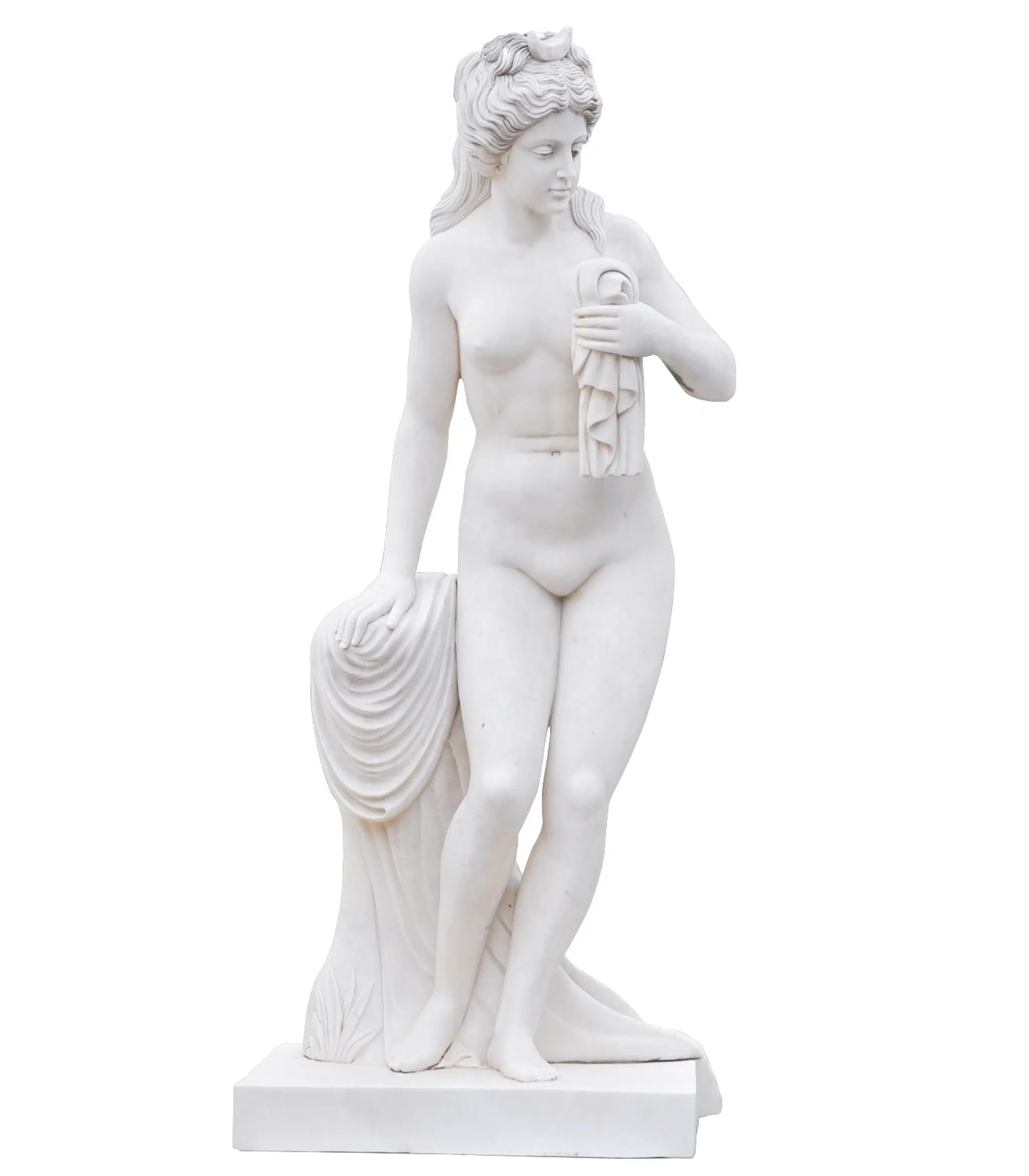 An incredible nude female statue carved from solid marble, this life like piece depicts a woman drying herself after a bath. Shown in a white marble, her beautiful and graceful figure will add a touch of elegance to the surroundings.
