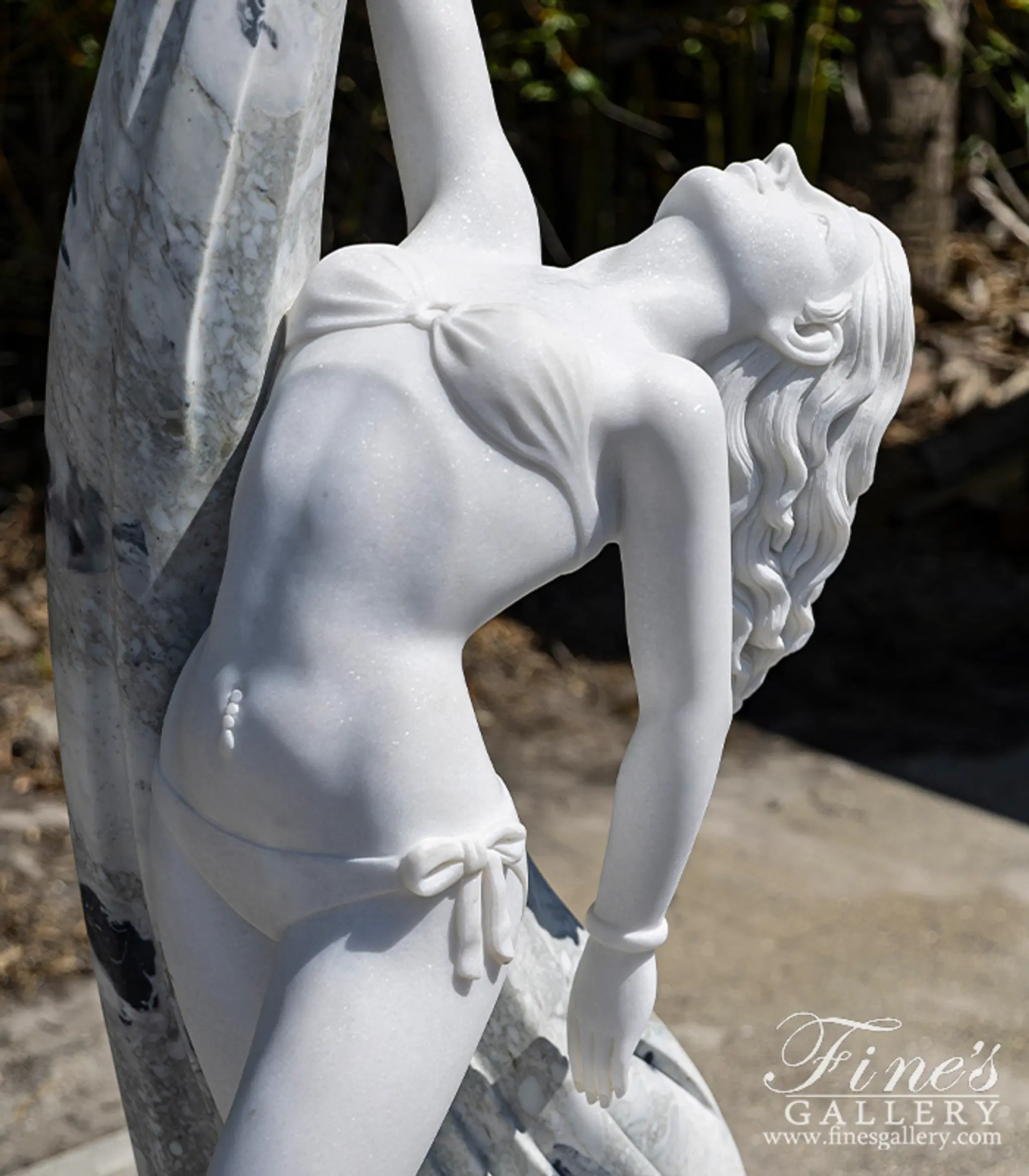 Life Size Dancing Bikini Girl Marble Statue - Elegant Pool Side Sculpture Elevate your outdoor space with this exquisite life-size dancing bikini girl statue hand-carved from premium Statuary White and Arabascato Marble. This joyful, graceful figure brings beauty and relaxing intimacy to any pool area or beach house setting. The detailed craftsmanship showcases the marble's natural elegance while the dynamic pose creates a sense of movement and celebration. A stunning decorative piece that serves as both a sophisticated artistic statement and conversation starter for luxury homes, resorts, or upscale commercial spaces.