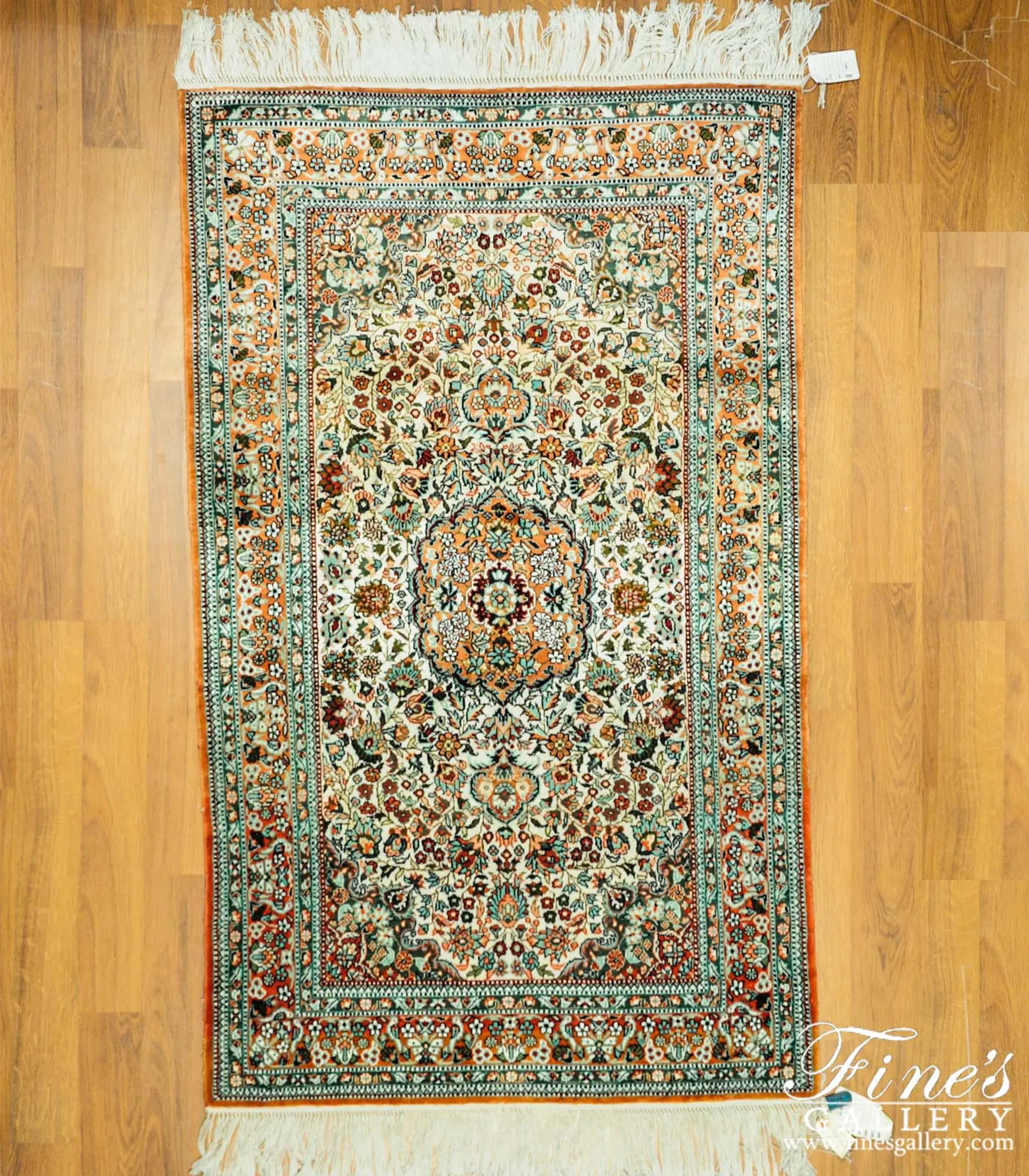 Red, teal and coral on an ivory background in this hand knotted silk rug. Please call 1-866-860-1710 and talk with a sales representative at anytime.