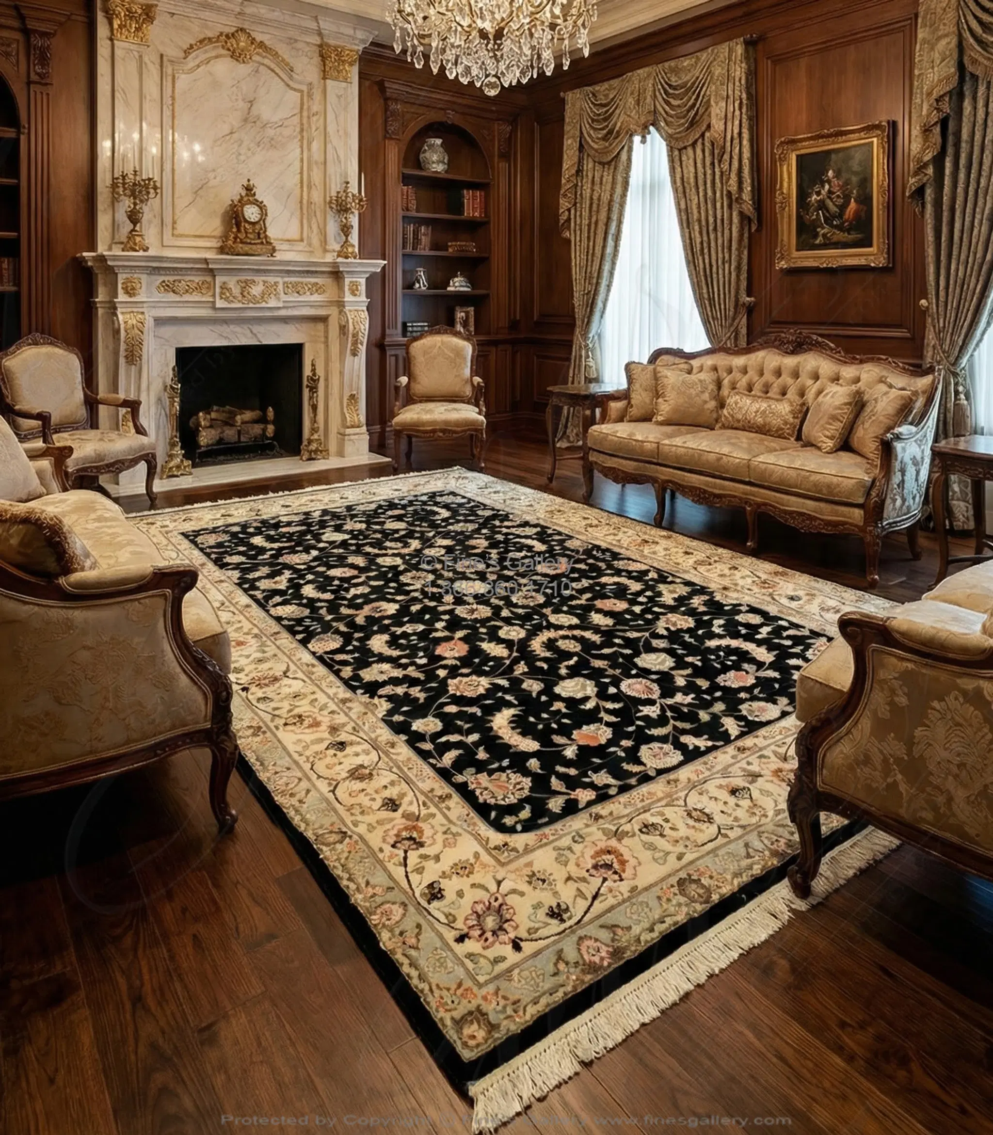 Rich black hand knotted wool rug with a traditional patter of coral and cream. Please call 1-866-860-1710 and talk with a sales representative at anytime.