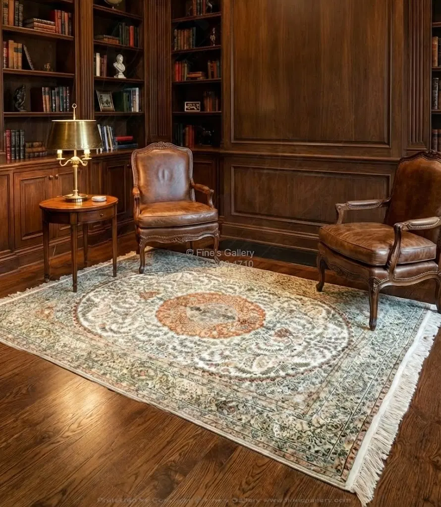 Hand Knotted Silk Rug - Pastel Ivory, Coral & Green Rectangular Area Rug - Fine's Gallery