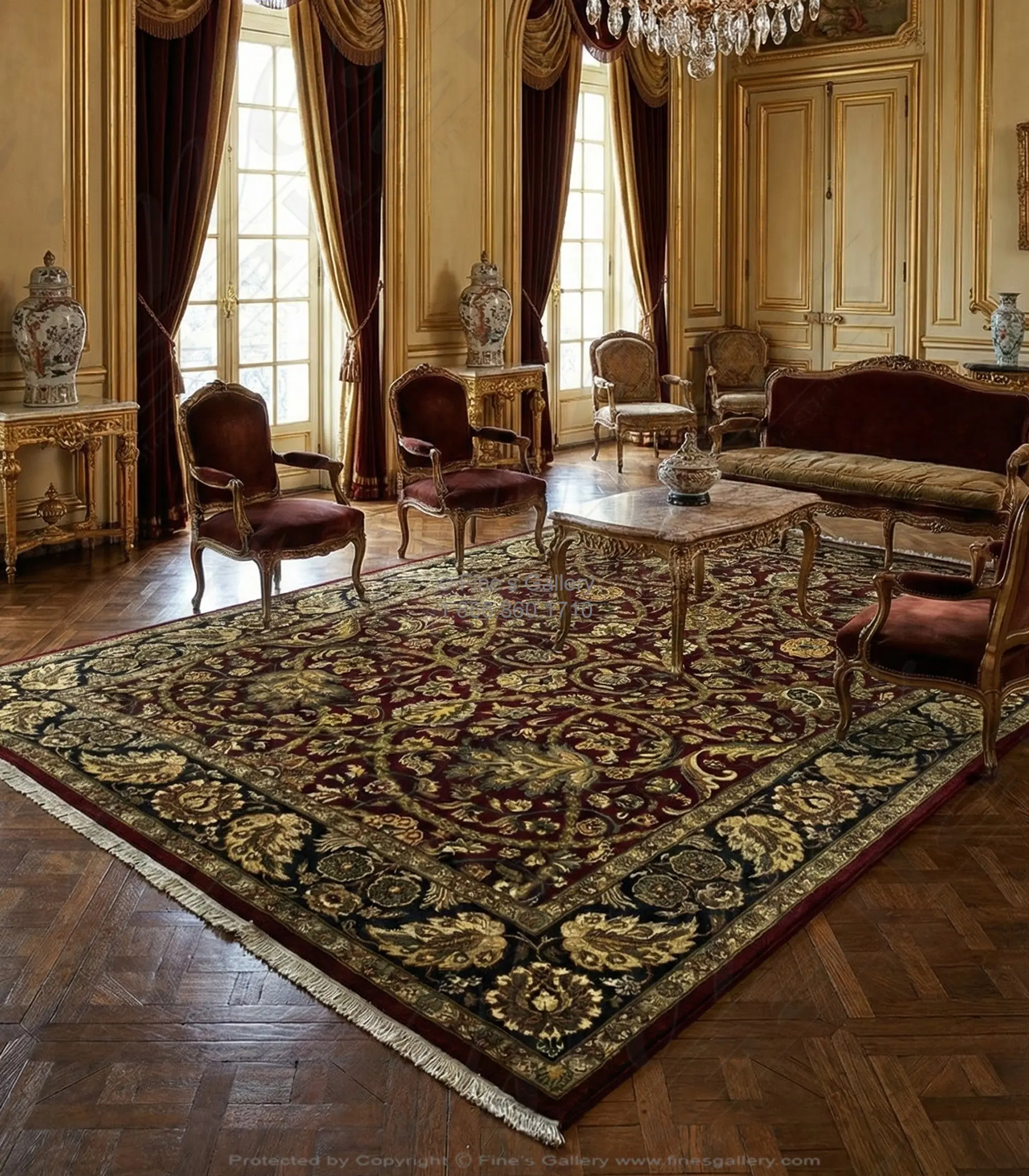 Rich red hand knotted wool rug with gold green and black in this traditional rug. Please call 1-866-860-1710 and talk with a sales representative at anytime.