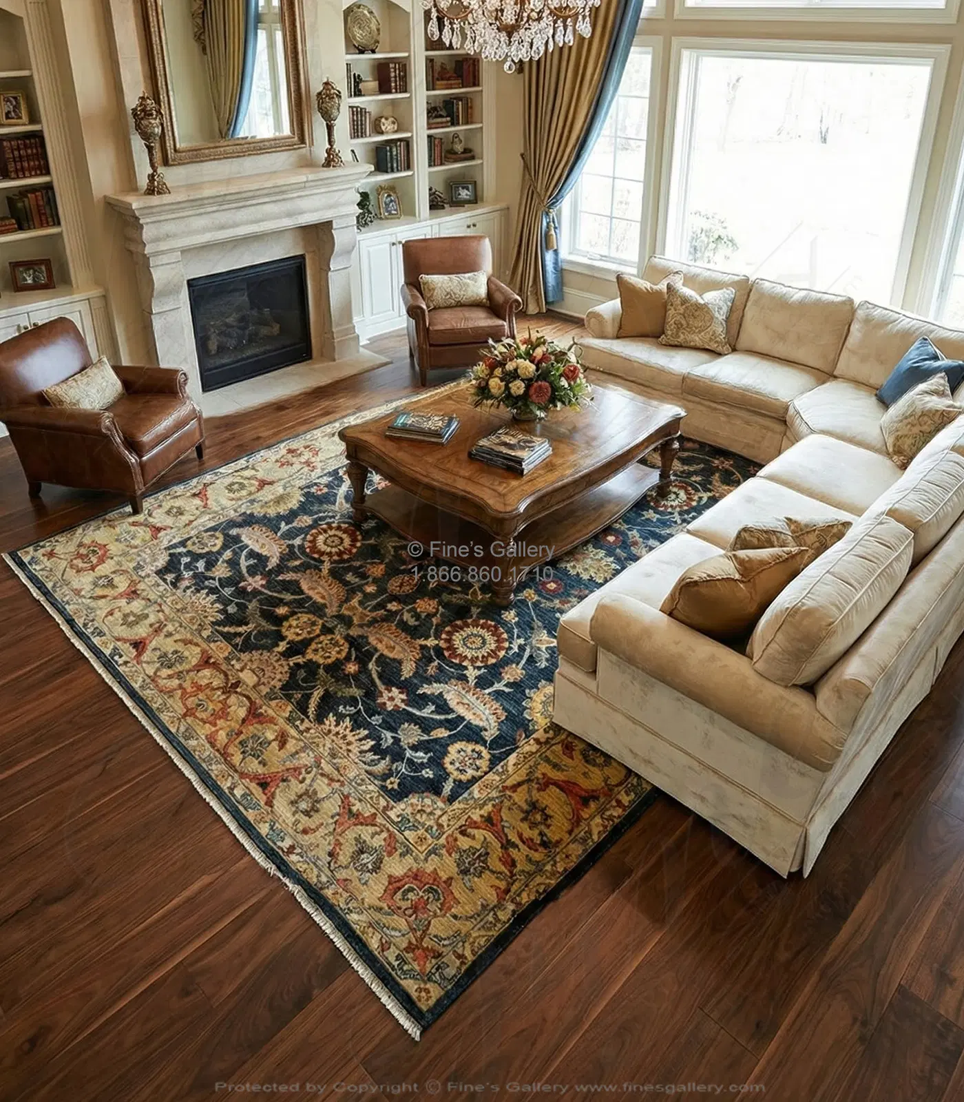 Hand Knotted Wool Rug Rectangle - Gradient Blue and Red with Gold Border - Luxury Area Rug