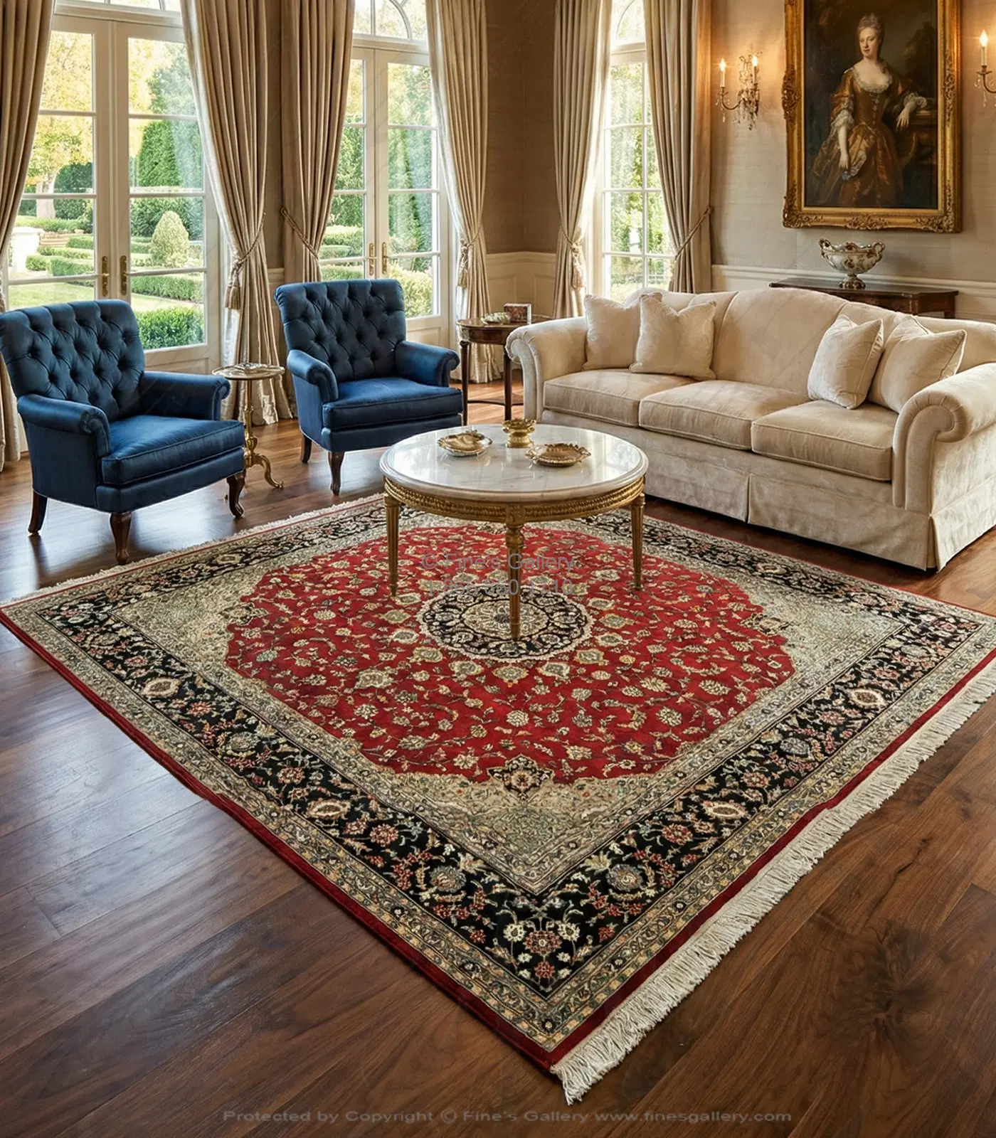 Traditional Silk Hand Knotted Square Rug - Deep Red and Indigo Medallion Design