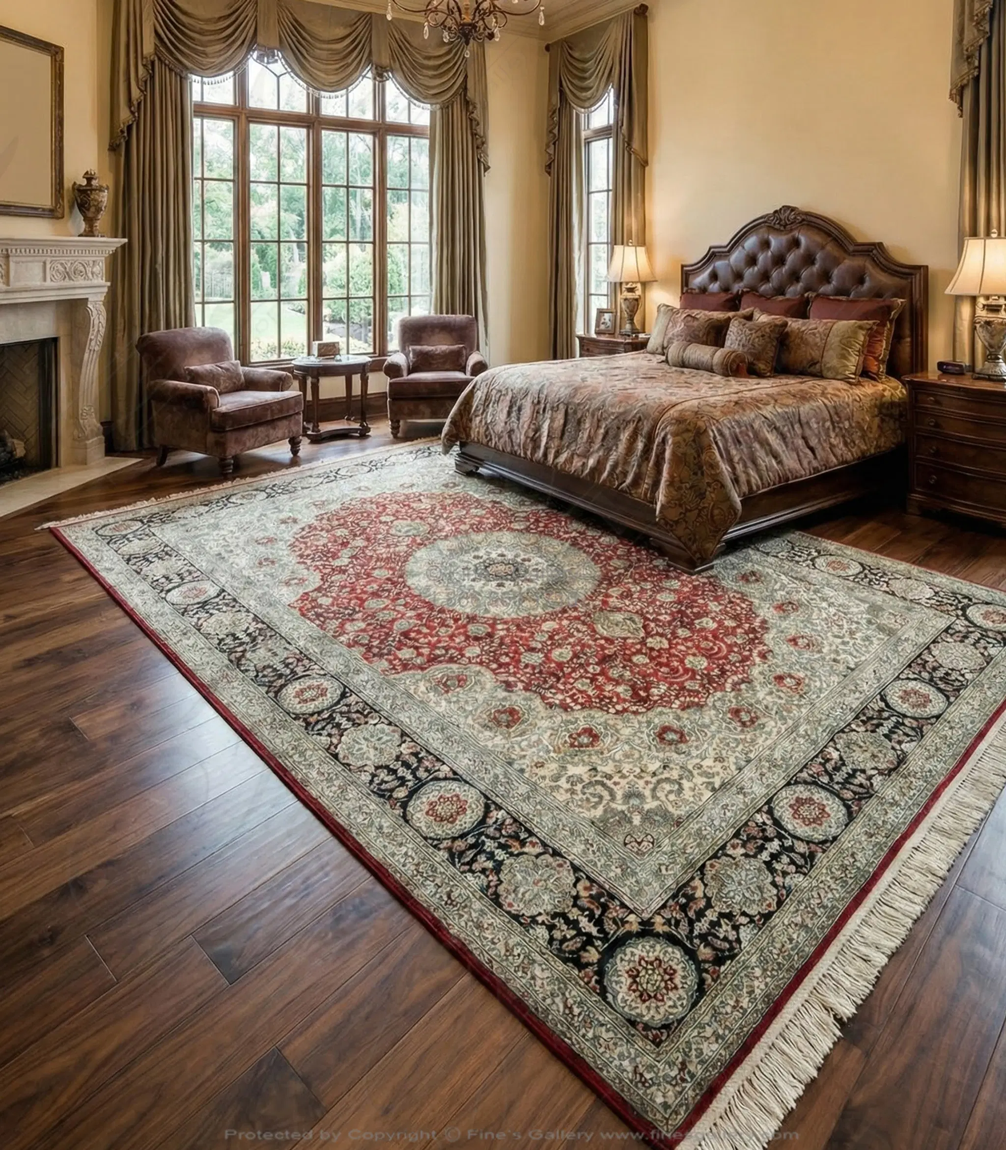 Hand Knotted Silk Rug Rectangle - Red, Ivory and Indigo Traditional Design - Luxury Area Rug