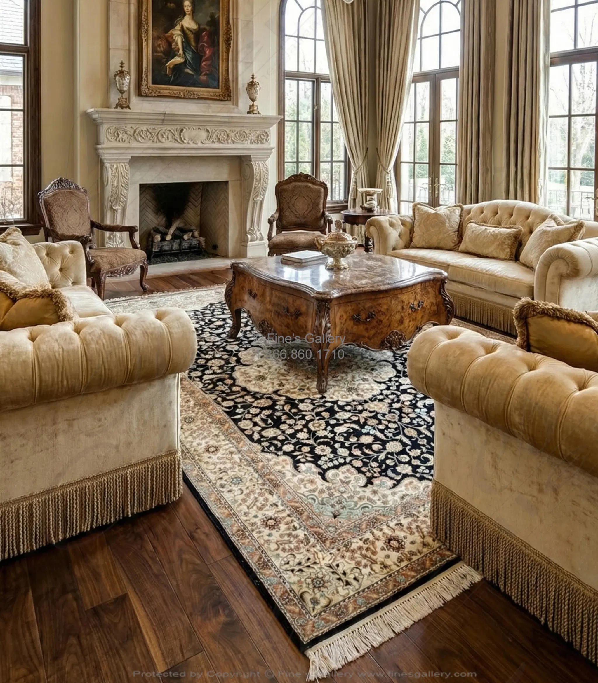 Hand knotted silk rug with a deep indigo field coral pattern and an ivory border. Please call 1-866-860-1710 and talk with a sales representative at anytime.
