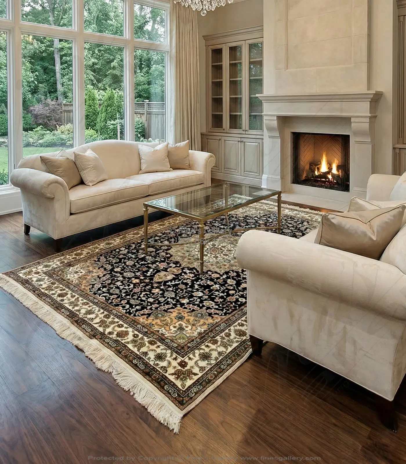 Hand Knotted Silk Rug Rectangle - Dark Indigo with Coral Accents and Ivory Border