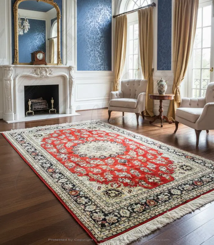 Exquisite Hand-Knotted Silk Area Rug featuring vibrant red, gold, ivory, and indigo hues in a luxurious rectangular design. This premium quality rug showcases intricate artisanal craftsmanship with meticulous knotting techniques that create a sumptuous texture and exceptional durability. Perfect as a statement piece for living rooms, dining areas, or executive offices, this elegant floor covering adds sophisticated warmth to any interior design scheme. Available for personalized consultation at 1-866-860-1710.