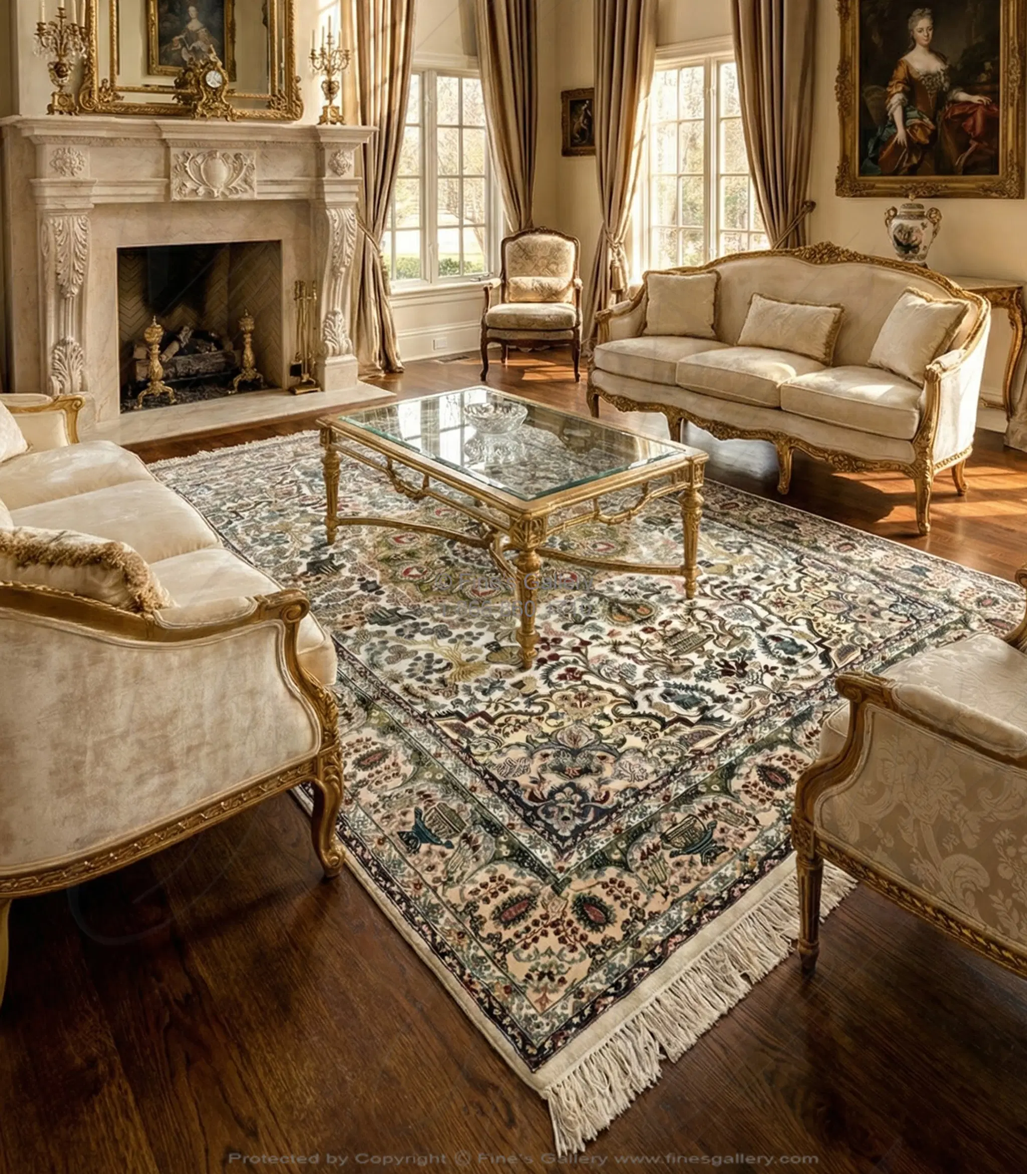 Handcrafted Ivory Silk Rug with Blue, Green, Red & Black Accents - Luxury Rectangle Area Rug
