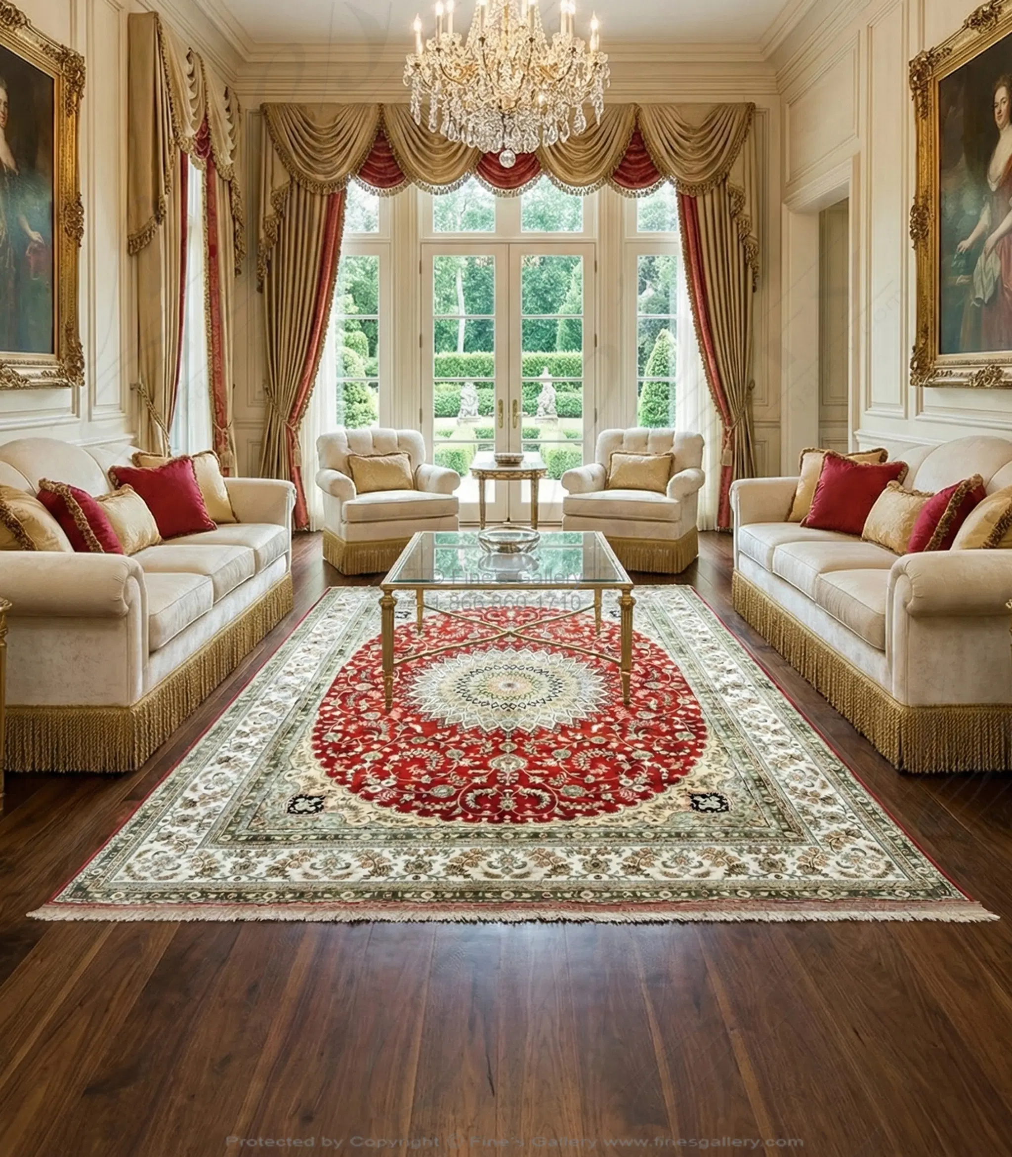Hand Knotted Silk Rug Rectangle - Red and Ivory with Green Border - Luxury Oriental Design