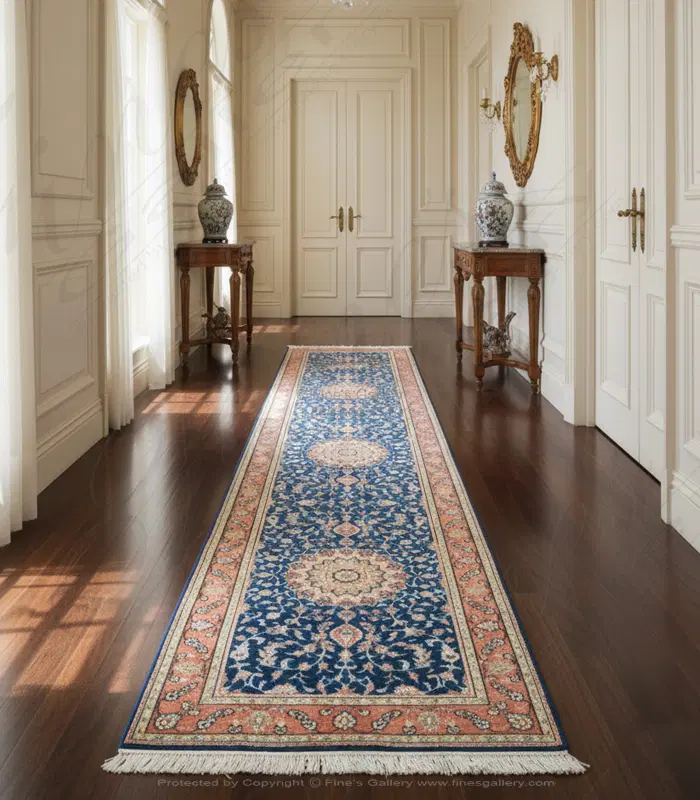 Exquisite Hand-Knotted Silk Runner Rug featuring a vibrant bright blue field complemented by an elegant pink border. This luxury Oriental carpet showcases superior craftsmanship with intricate detailing that elevates any hallway, entryway or narrow space. The premium silk construction offers exceptional softness underfoot while providing remarkable durability and a sophisticated sheen. Perfect for adding a touch of refined elegance to your home décor. For personalized assistance, our knowledgeable sales representatives are available at 1-866-860-1710.