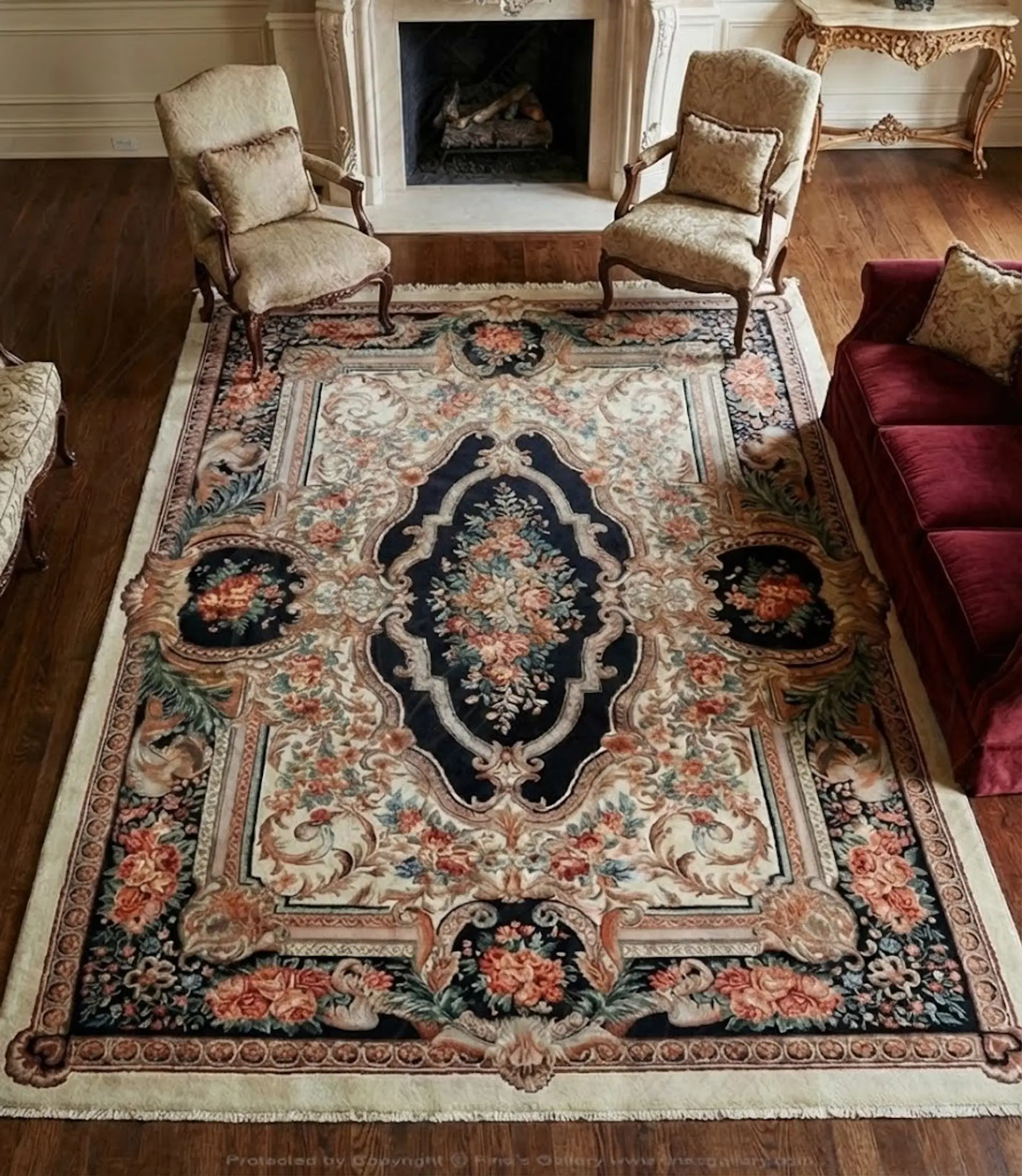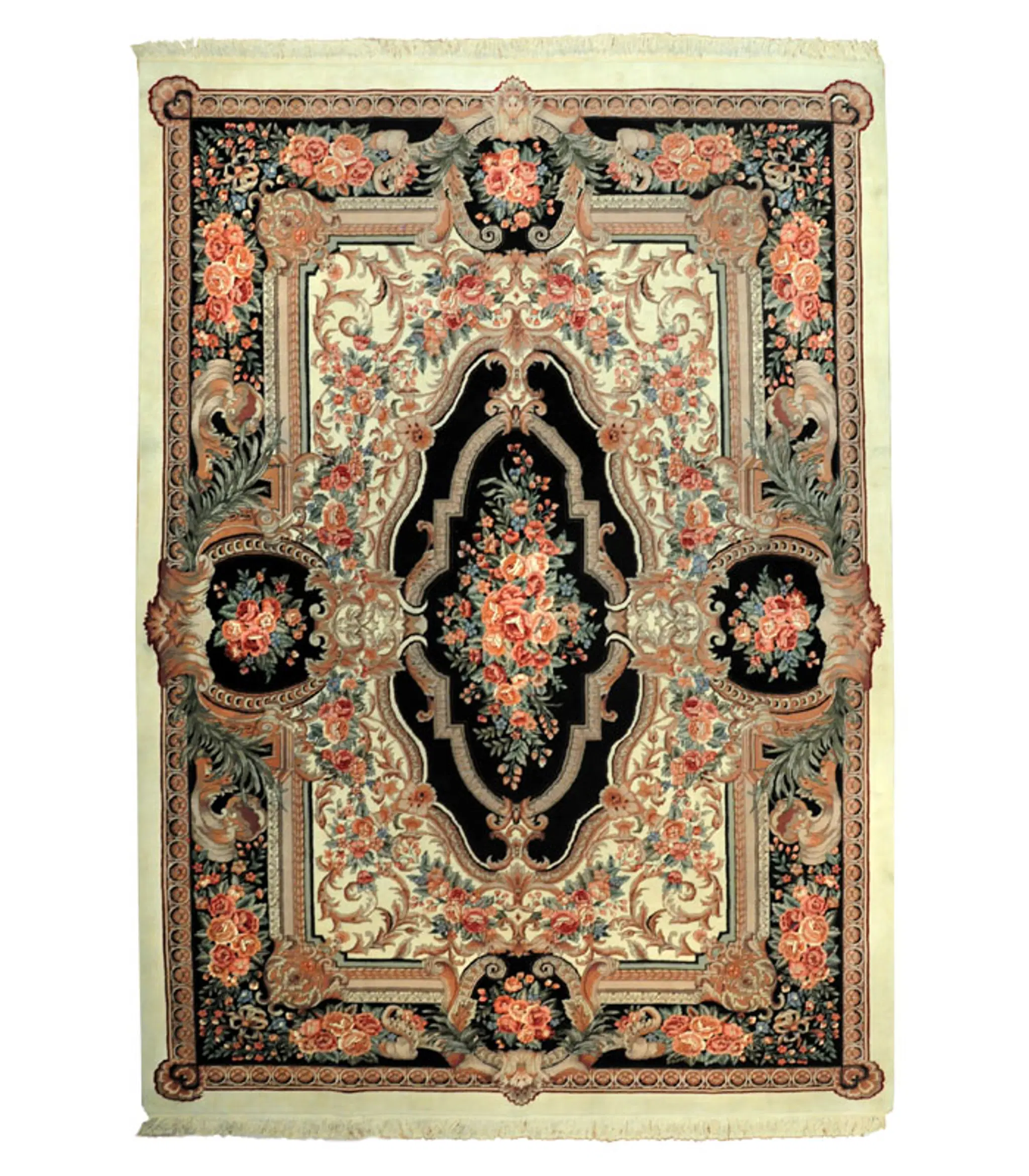 Mauve red and ivory in this hand knotted wool rug with a black border and a classic medallion in the center. Please call 1-866-860-1710 and talk with a sales representative at anytime.