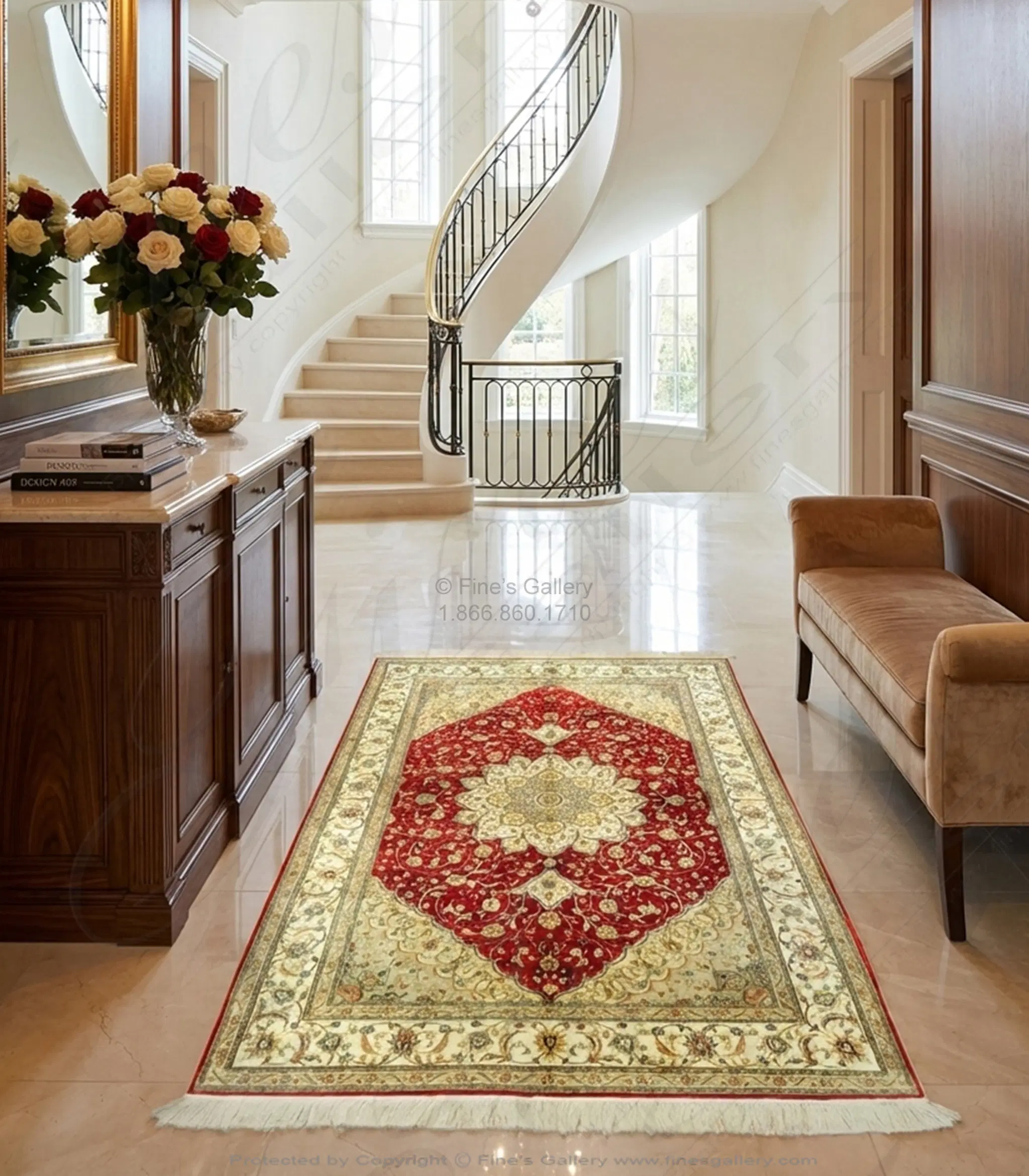 Silk hand knotted rug in bright red, pale gold and ivory. Please call 1-866-860-1710 for more information.