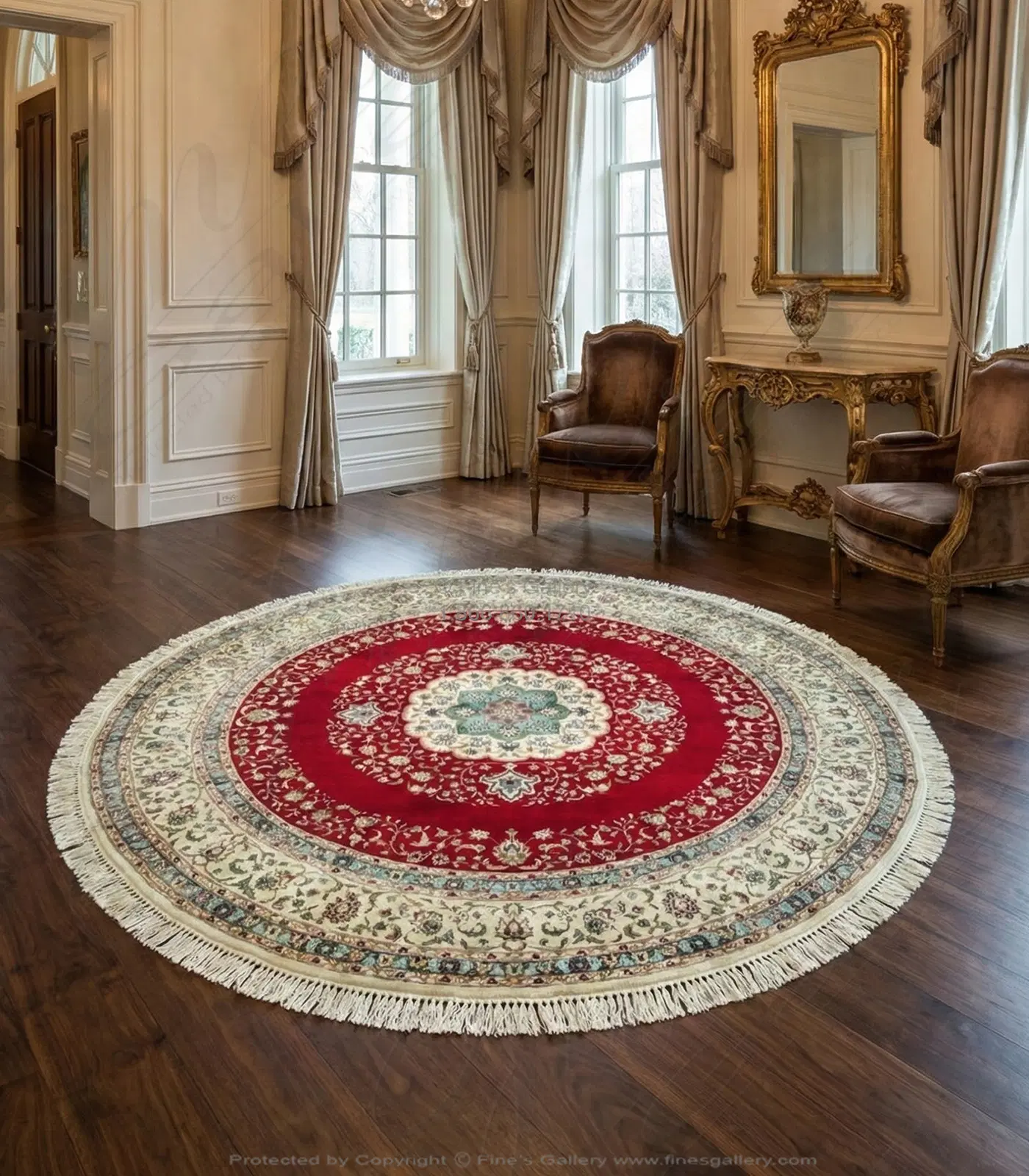 Hand Knotted Silk Round Rug - Dark Magenta with Cream & Aqua Border - Luxury Home Decor - R7038 (View 2)