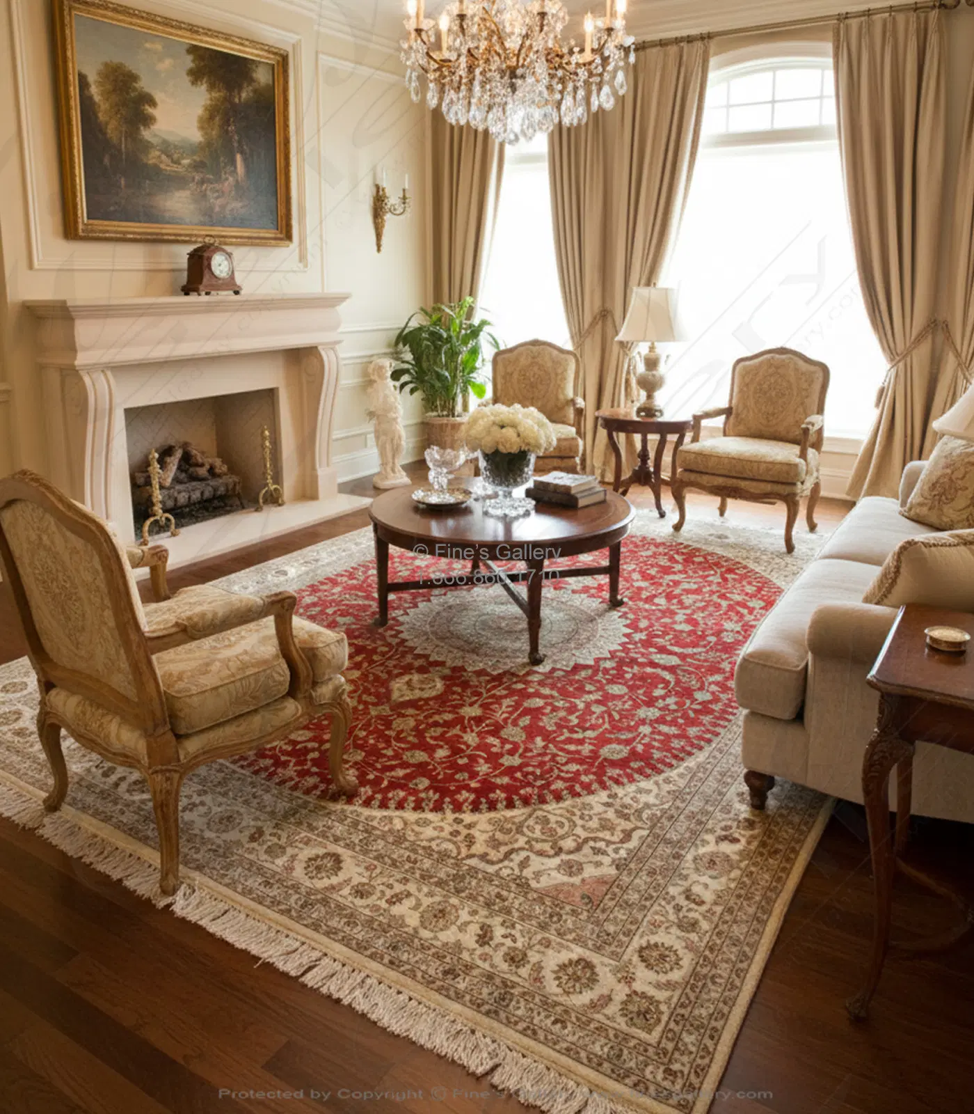 Exquisite Hand-Knotted Silk Area Rug in Rich Red and Ivory with Coral Accents - Luxury Rectangle Carpet for Elegant Home Decor - Premium Quality Artisan Craftsmanship - Timeless Design from Fine's Gallery Collection