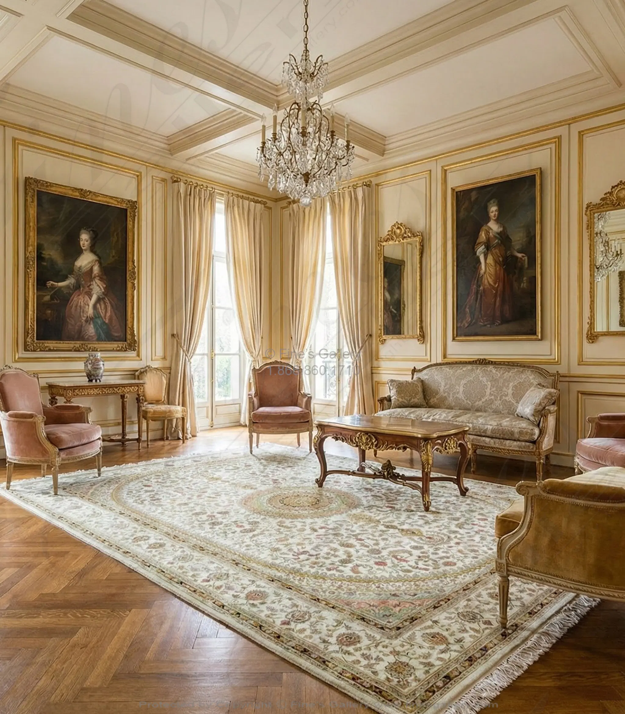 Hand Knotted Silk Rug Rectangle - Ivory Gold with Blue and Red Accents - Luxury Home Decor