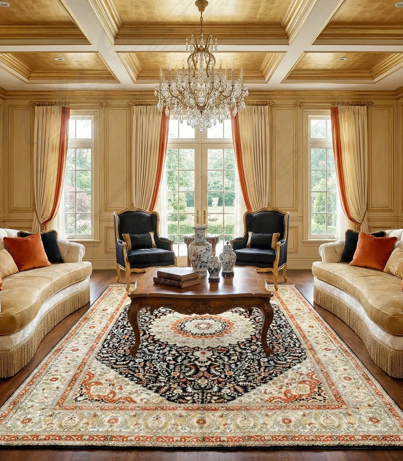 This mansion size rug is indigo, coral and ivory made from very fine hand knotted silk. Please call 1-866-860-1710 and talk with a sales representative at anytime.