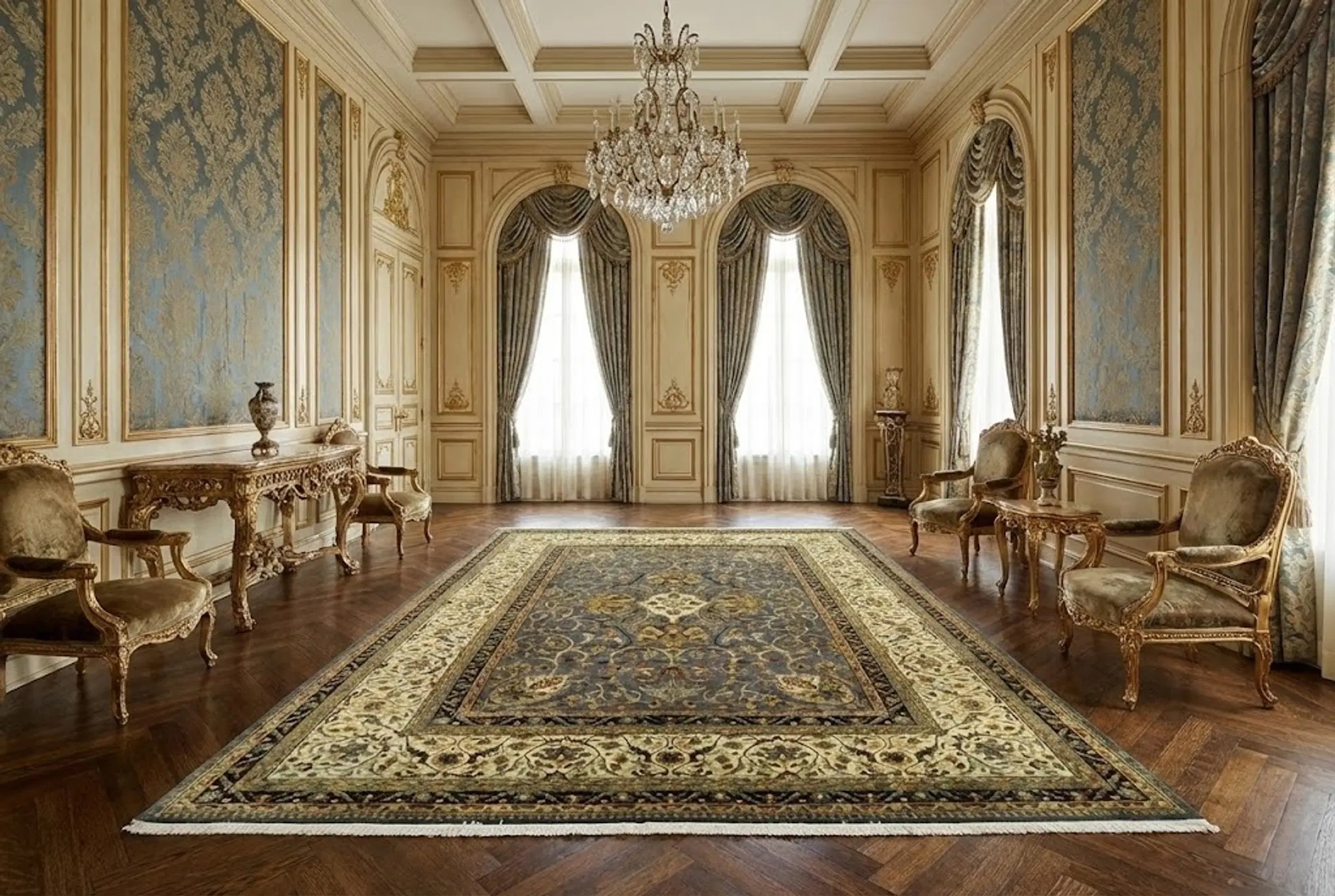 Grey Hand Knotted Traditional Rug with Ivory Border - Rectangle Area Rug