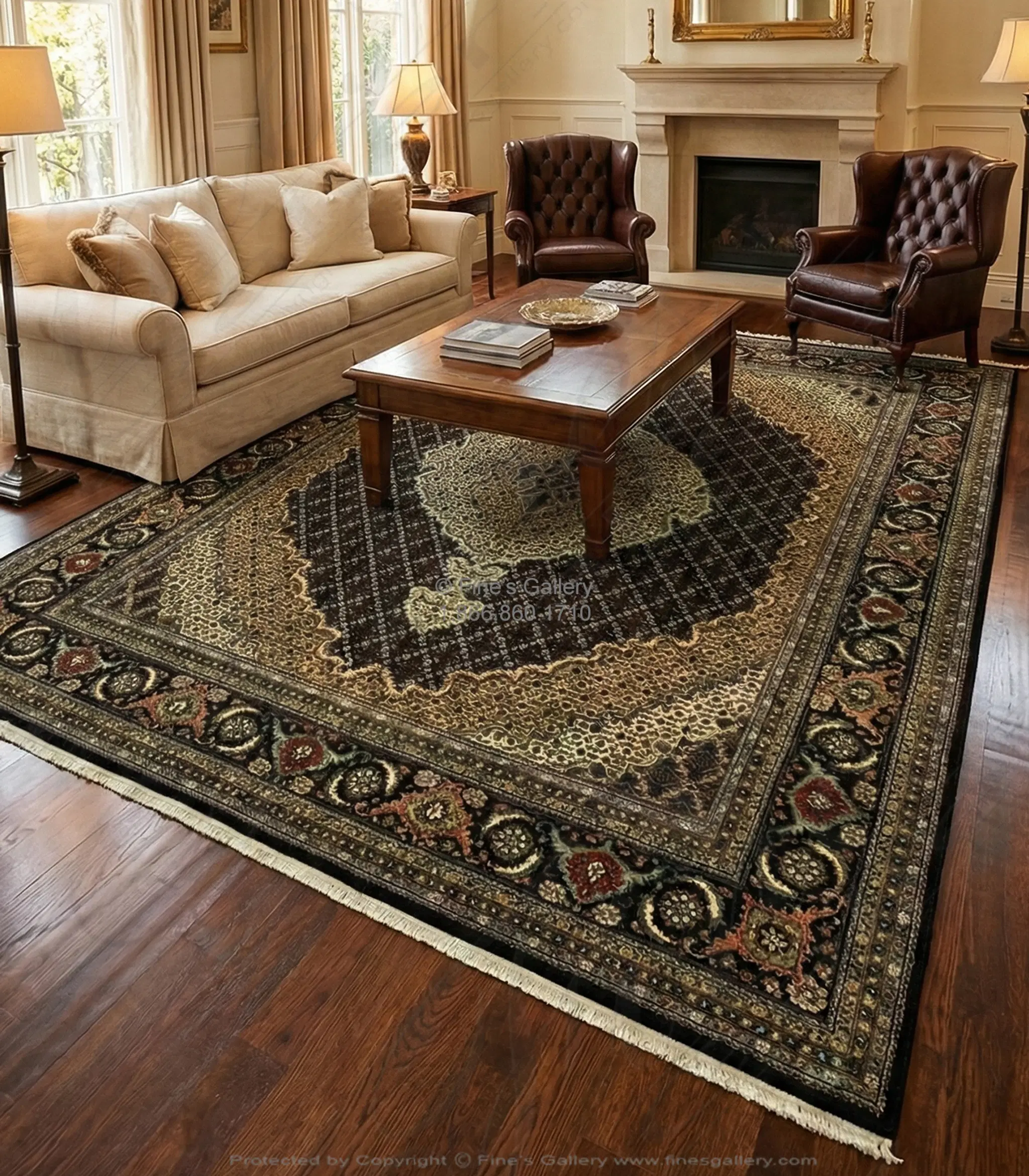 Rich black hand knotted wool with silk highlights in this traditional beauty. Please call 1-866-860-1710 for more information