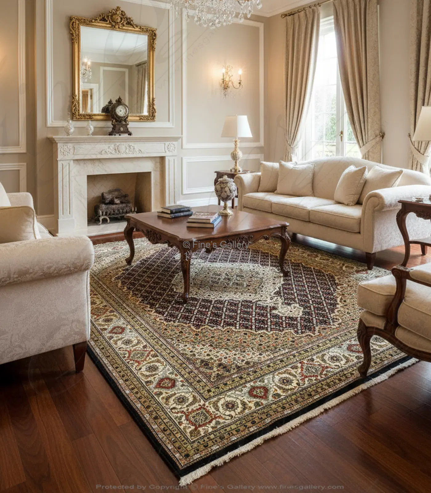 Traditional Hand-Knotted Wool & Silk Rug Rectangle - Black, Rust, Ivory & Green