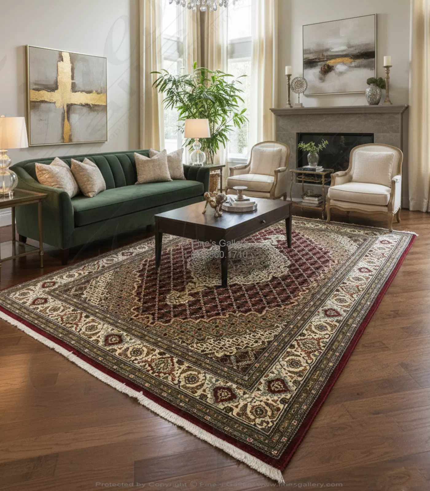 Hand Knotted Wool Rug with Silk Highlights - Rectangle Area Rug in Red, Ivory and Green - Luxury Home Decor