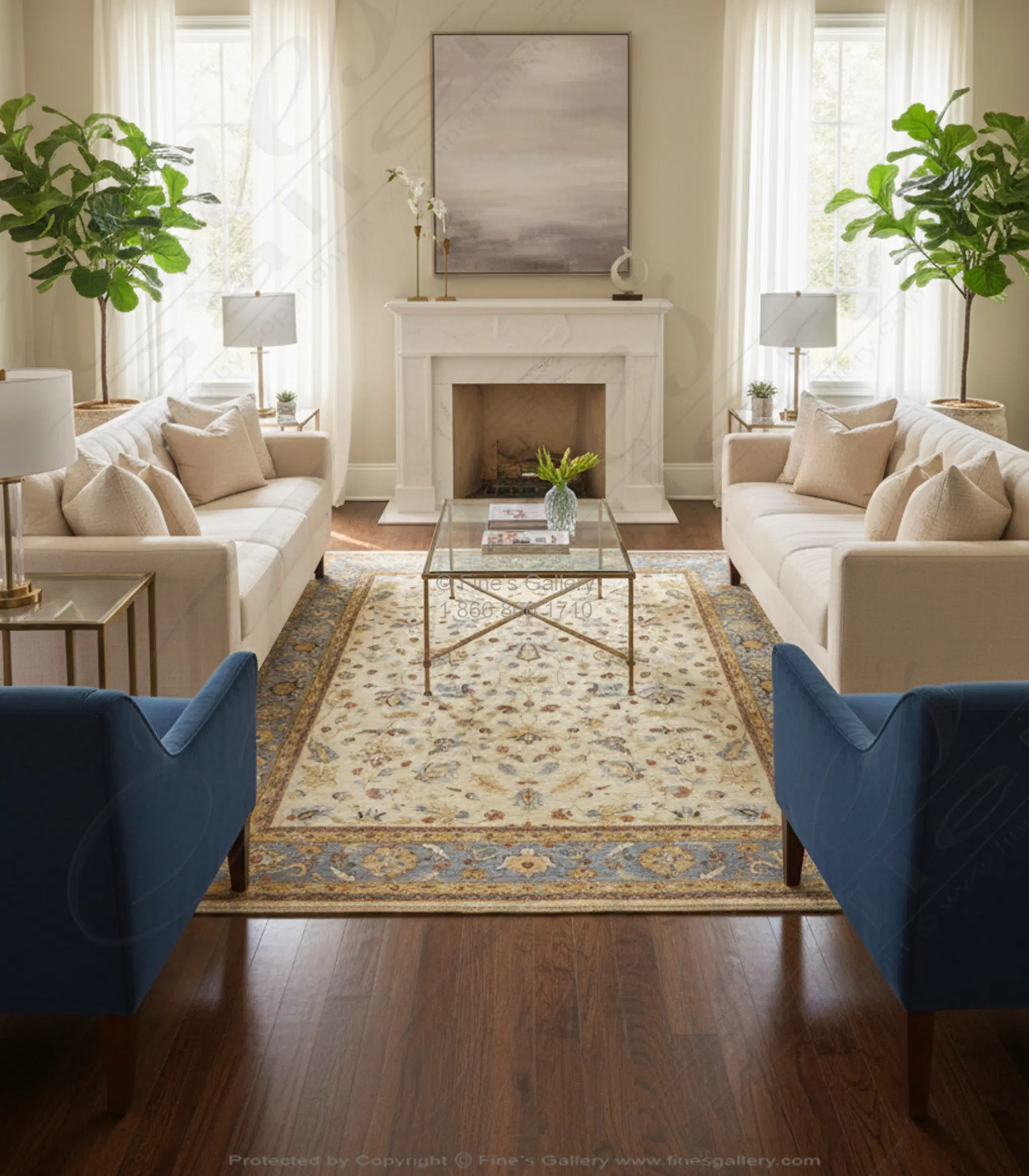 Hand Knotted Cream & Sky Blue Rectangular Rug with Gold, Rust & Black Accents - Fine's Gallery