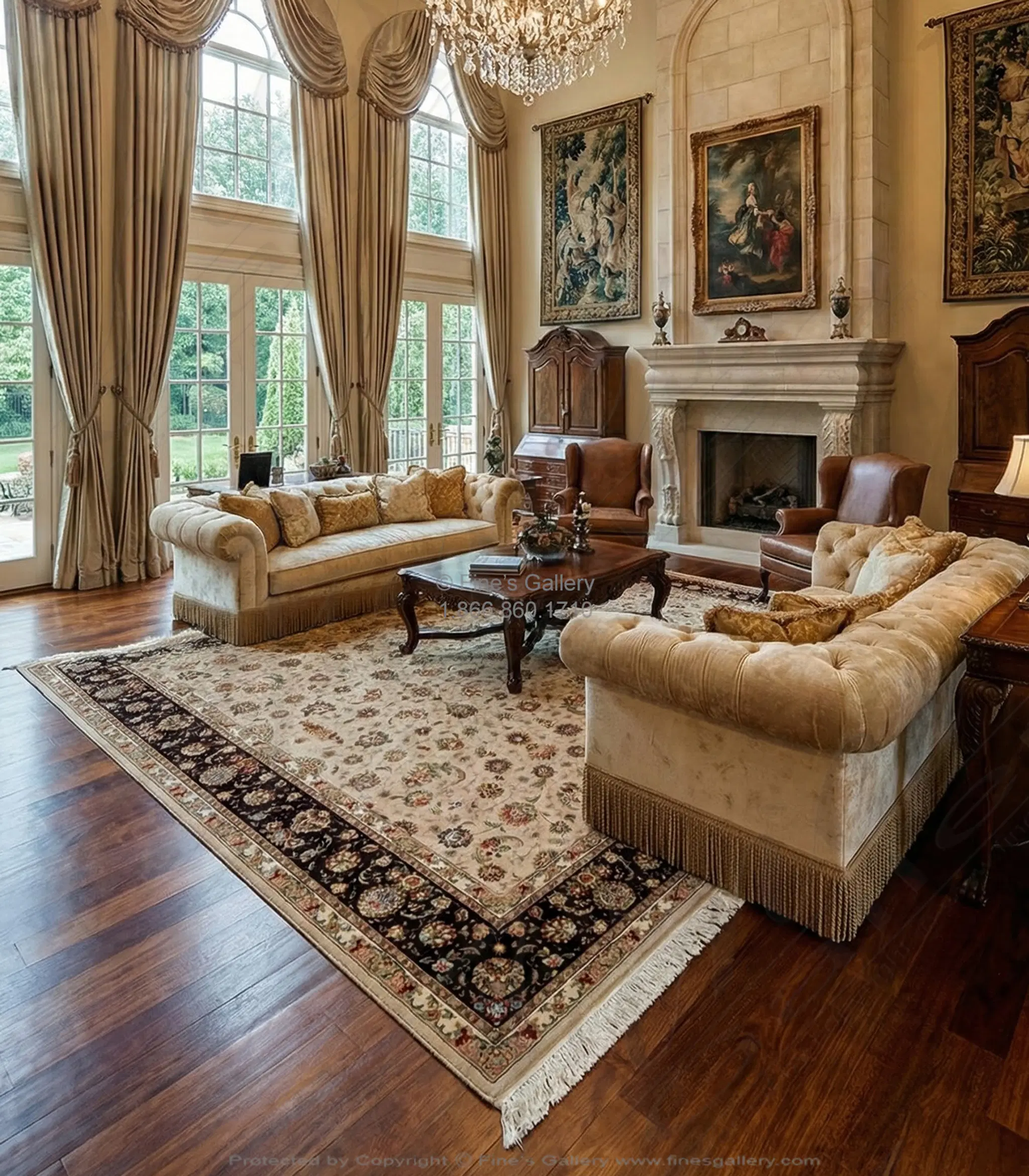 Pale taupe field with a red border in this traditional wool and silk hand knotted rug. Please call 1-866-860-1710 and talk with a sales representative at anytime.