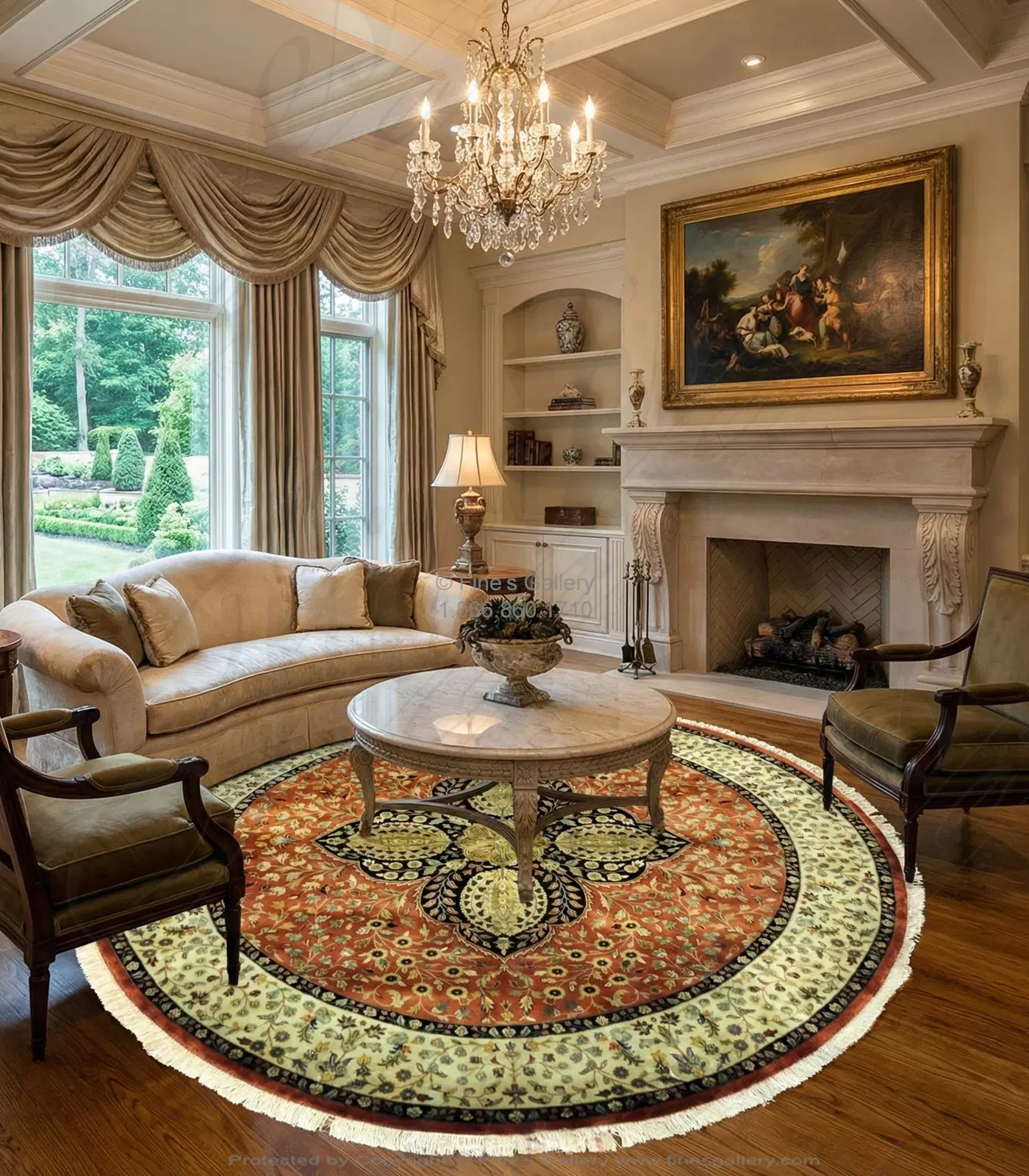 Hand Knotted Wool Round Rug - Deep Rust with Gold and Black Accents - Traditional Design