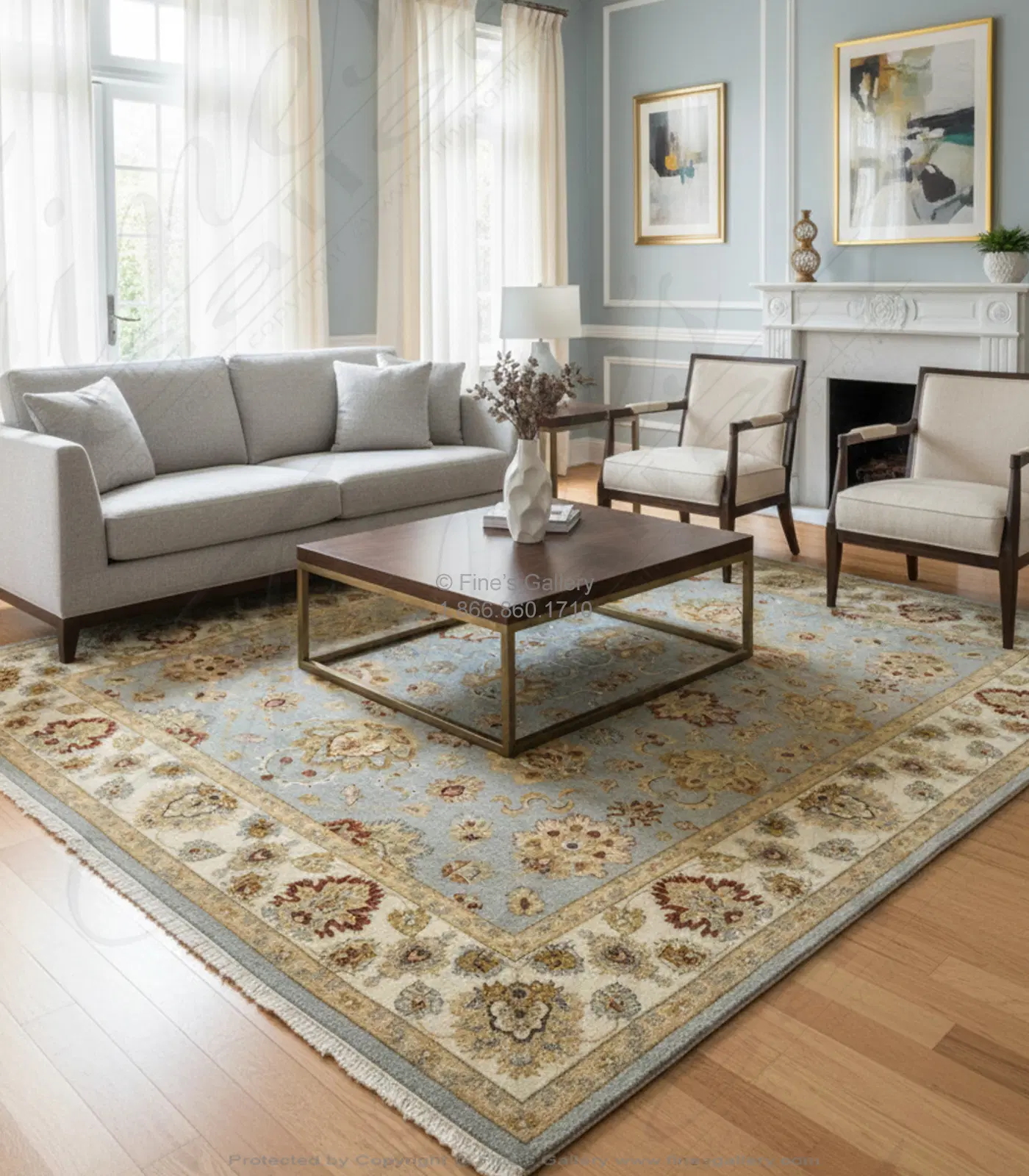 Beautiful sky blue hand knotted wool rug with gold and rust with a cream border. Please call 1-866-860-1710 and talk with a sales representative at anytime.