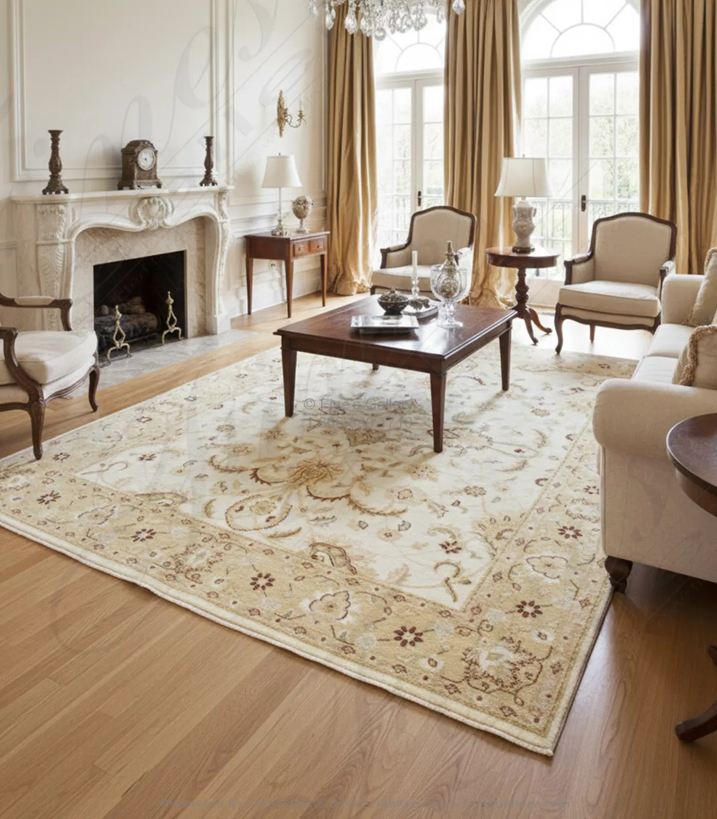 Hand Knotted Wool Rug Rectangle - Cream and Gold with Deep Rust Accents - Luxury Home Decor