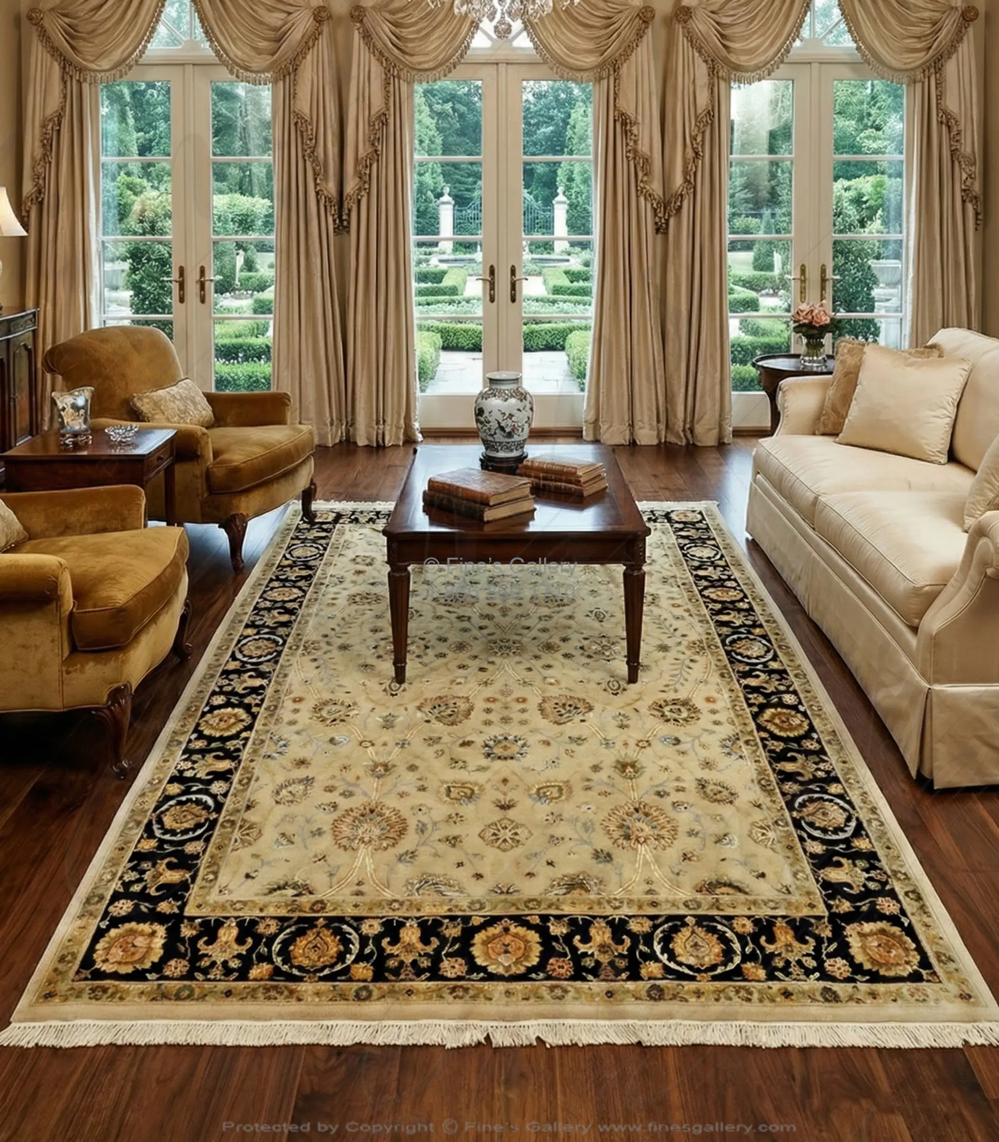 Hand knotted wool rug with a beige field and a traditional pattern in raised silk. Please call 1-866-860-1710 and talk with a sales representative at anytime.
