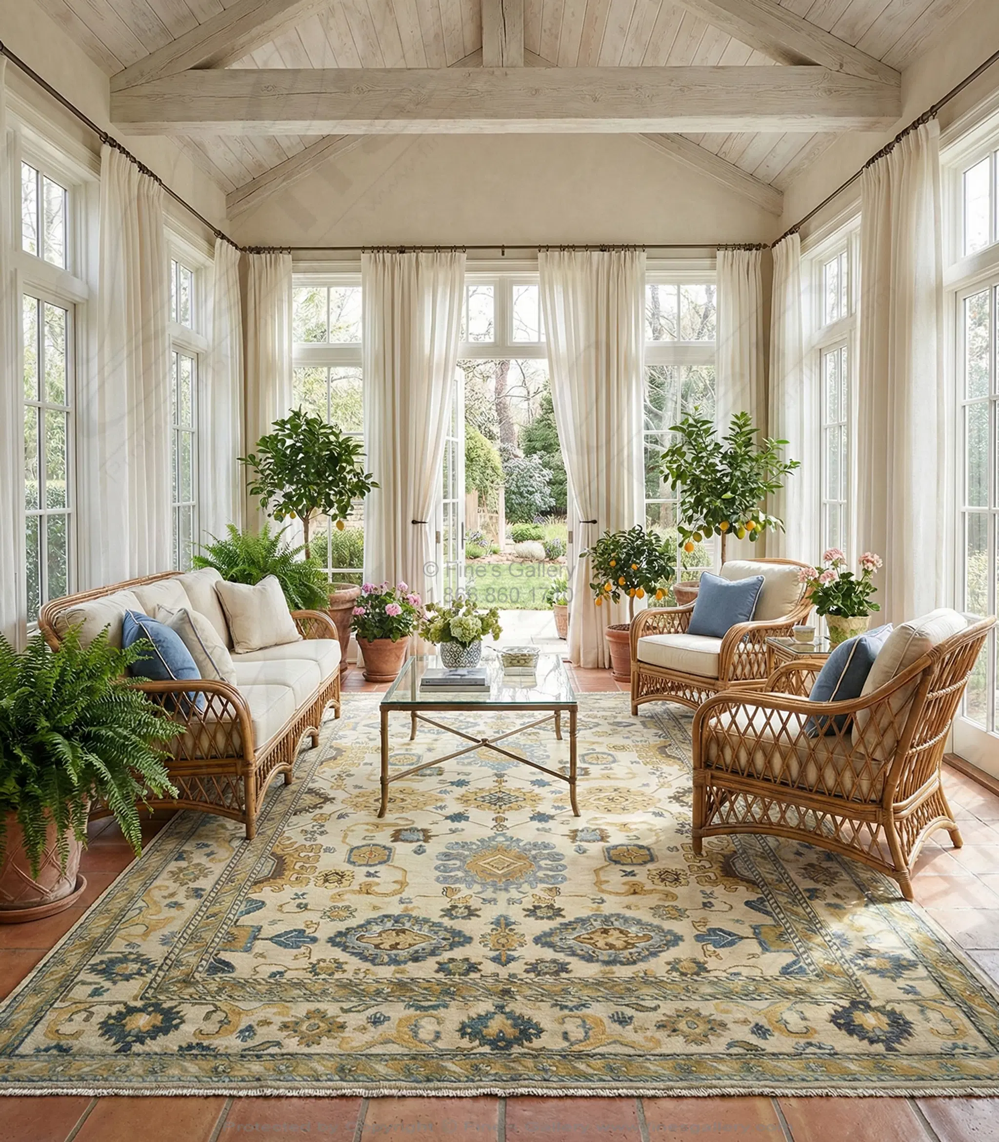 Handcrafted Oriental Oushak Rug - 100% Virgin Wool Rectangle Area Rug in Beige, Navy Blue and Green