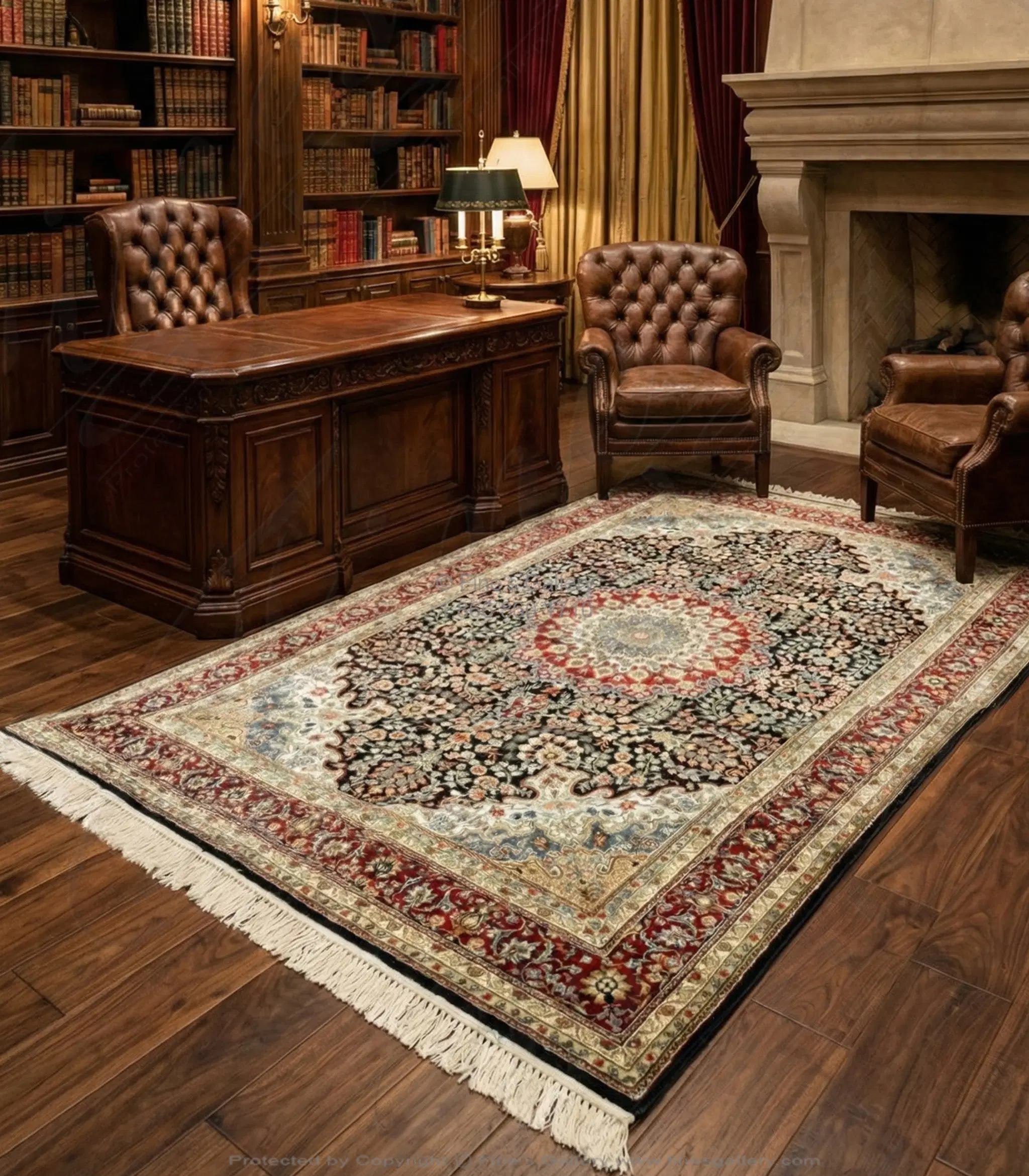 Hand Knotted Silk Rug Rectangle - Deep Indigo Red, Ivory & Smokey Blue Accent - Luxury Oriental Design