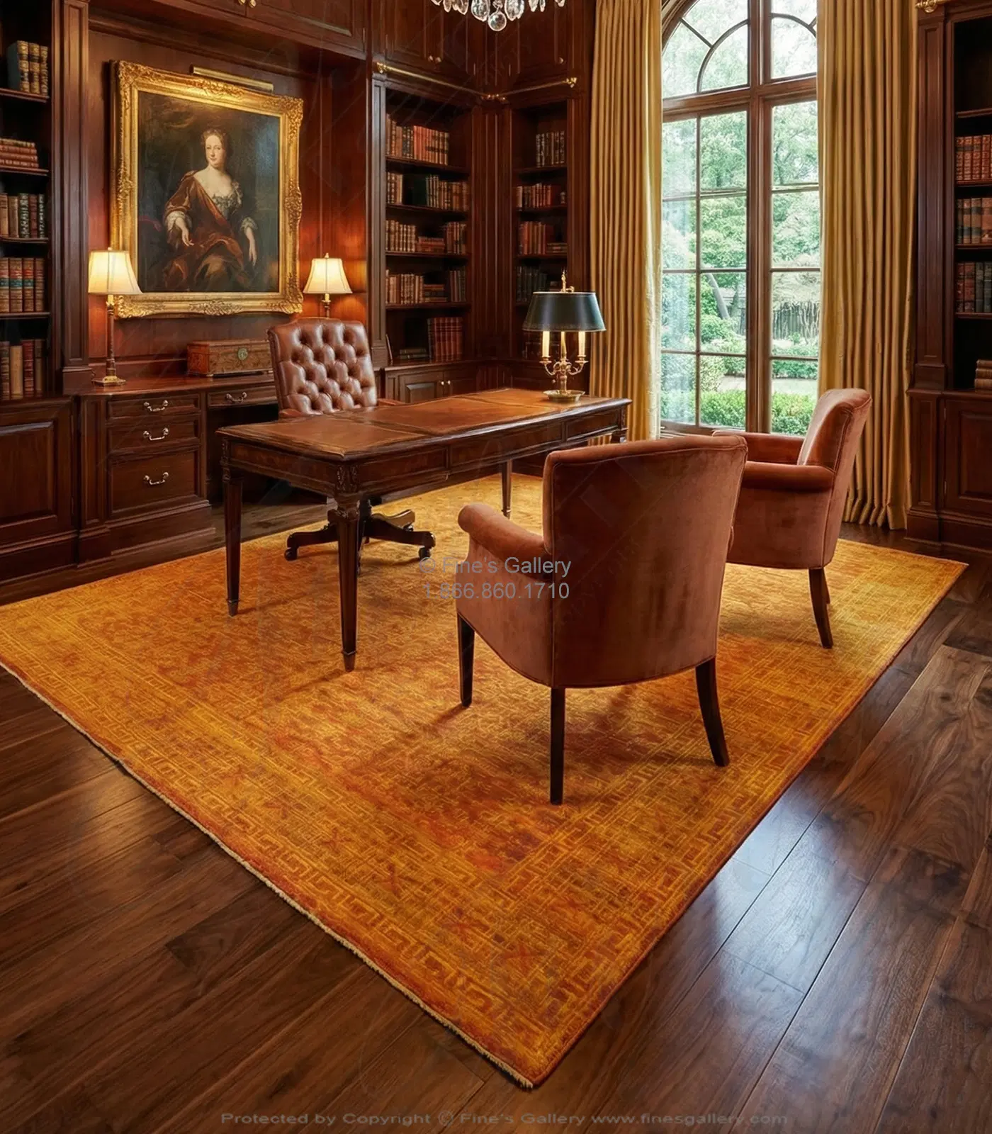 Hand-Knotted Oriental Wool Rug - Sunset Design in Copper Rust Orange & Gold - 120x120 Square - Indian Craftsmanship