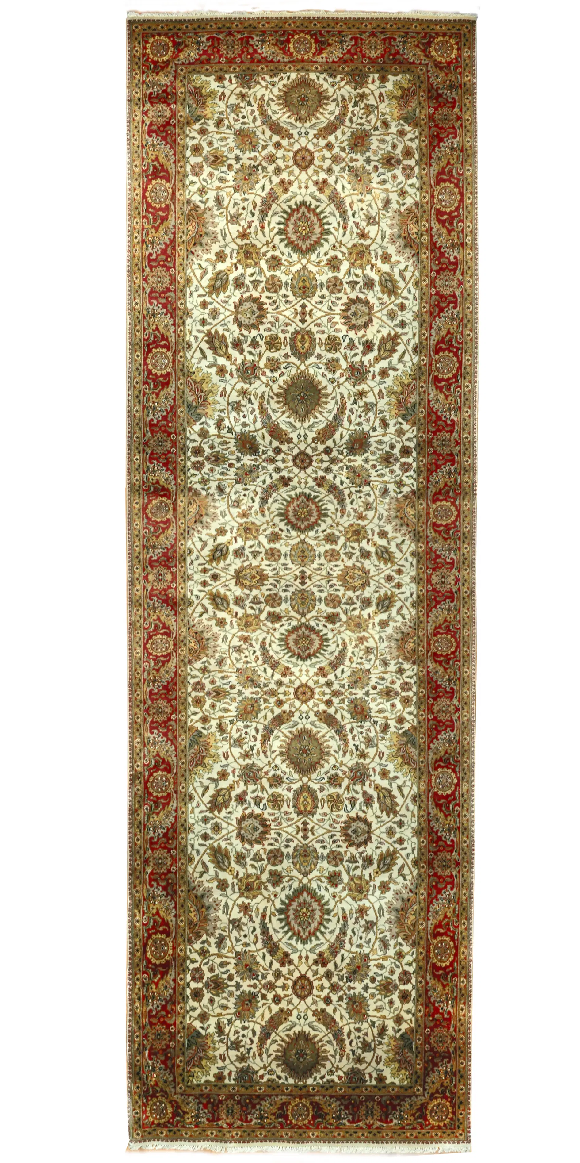 Hand knotted wool runner with a beige field and a ruby border in a traditional design. This is a mansion size. Please call 1-866-860-1710 and talk with a sales representative at anytime.