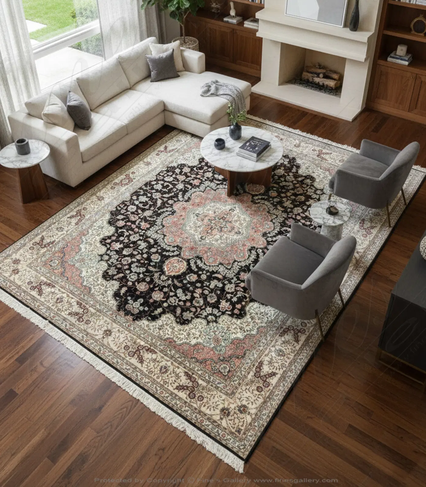Exquisite Hand-Knotted Silk Traditional Rug featuring a stunning medallion center in rich indigo and salmon hues. This luxurious rectangular area rug showcases meticulous craftsmanship with intricate traditional patterns that add elegance to any space. The premium silk construction ensures exceptional softness underfoot and remarkable durability. Perfect for elevating living