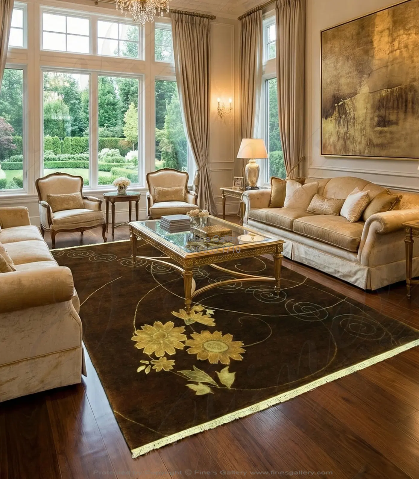 Dark chocolate hand knotted wool rug with a gold and beige floral spray. Please call 1-866-860-1710 for more information.